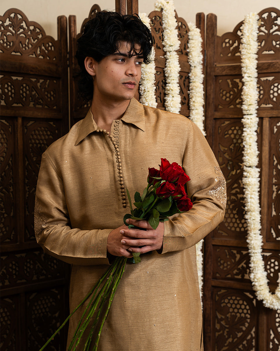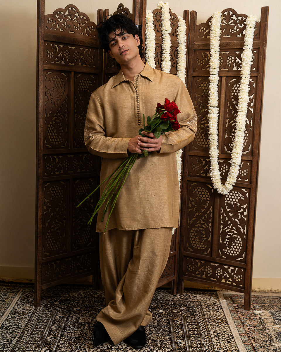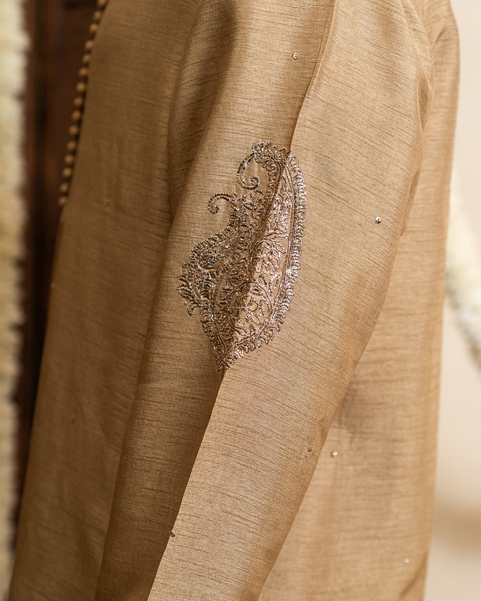 A beige raw silk kurta paired with a matching farshi shalwar, designed with refined detailing and timeless appeal. The kurta features a collared neckline with potli buttons, finished with intricate paisley motifs on the sleeves crafted in dabka pitta work. Delicate polka motifs are spread across the front and back, adding texture without overwhelming the silhouette. Thoughtfully designed with pockets, Zareesh brings together elegance, comfort, and craftsmanship.