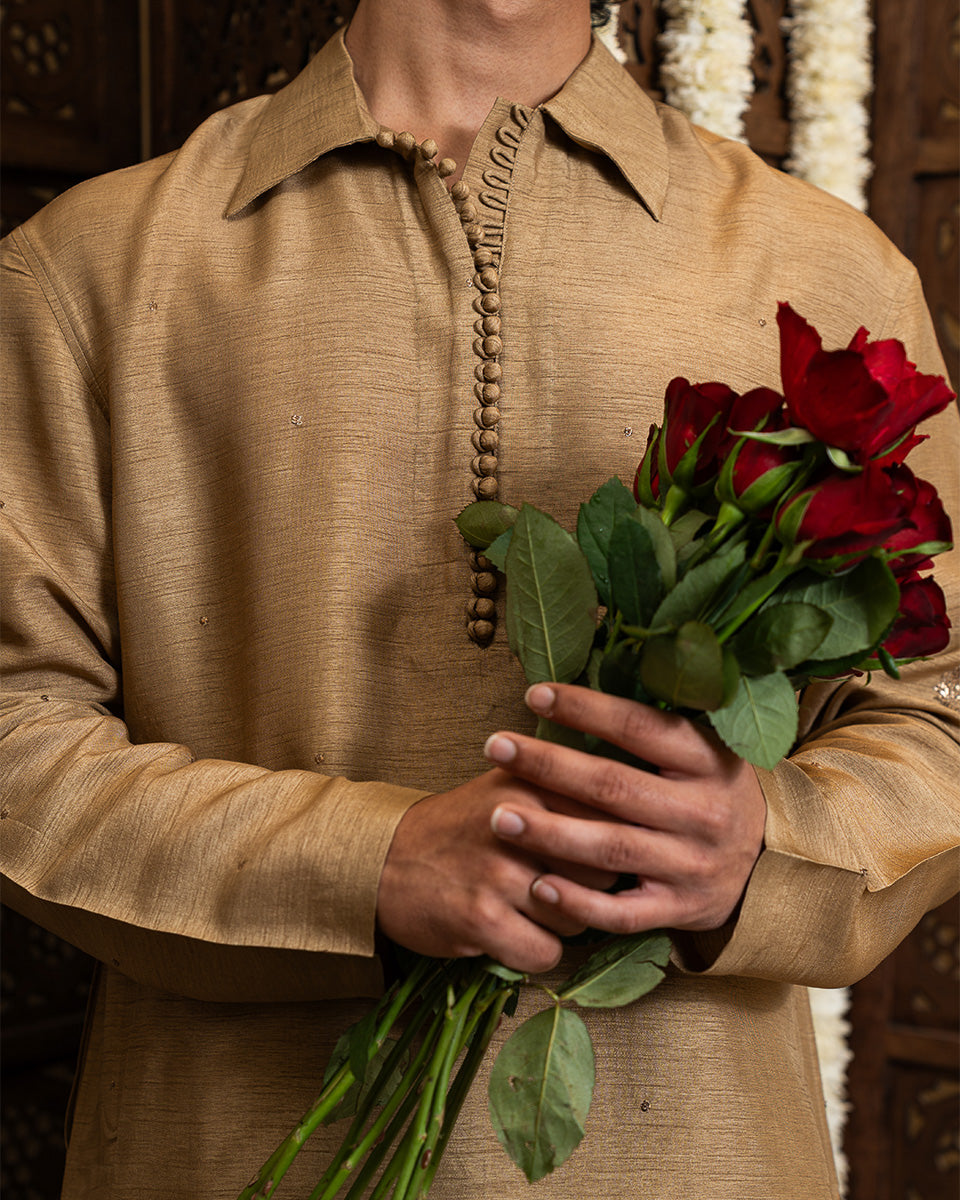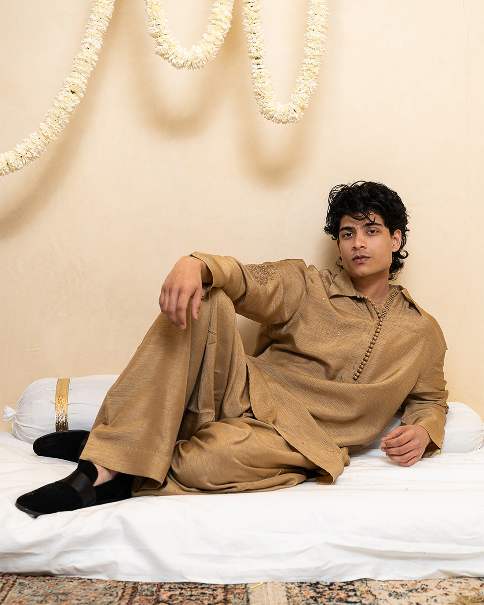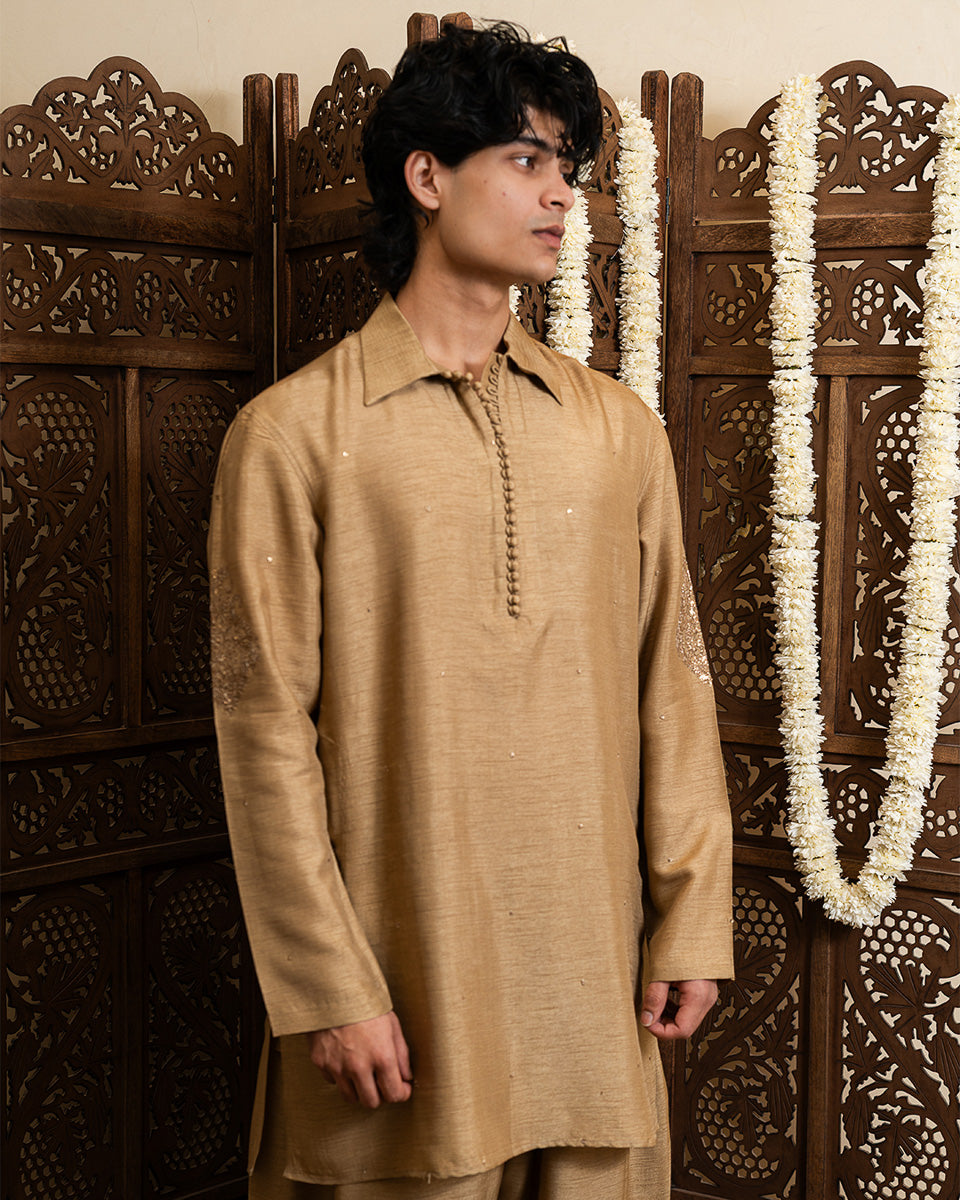 A beige raw silk kurta paired with a matching farshi shalwar, designed with refined detailing and timeless appeal. The kurta features a collared neckline with potli buttons, finished with intricate paisley motifs on the sleeves crafted in dabka pitta work. Delicate polka motifs are spread across the front and back, adding texture without overwhelming the silhouette. Thoughtfully designed with pockets, Zareesh brings together elegance, comfort, and craftsmanship.