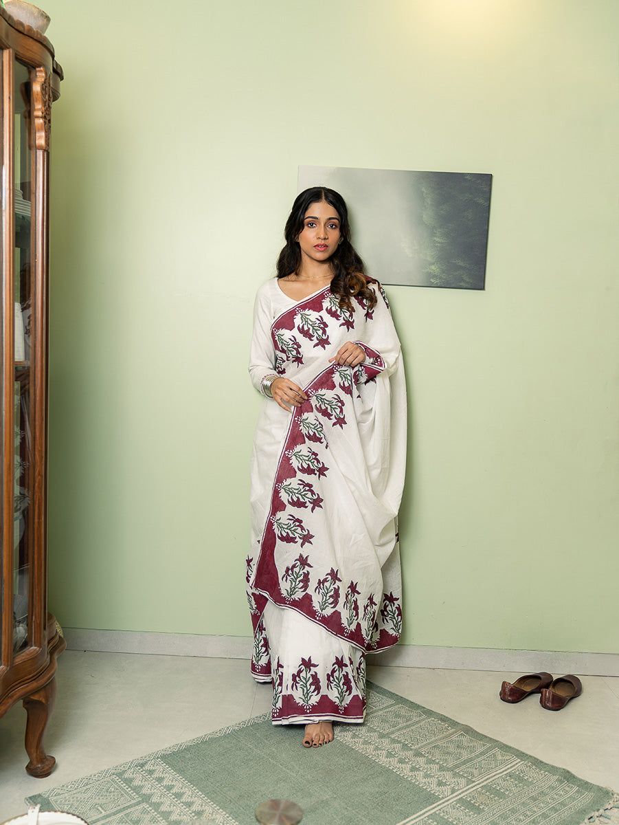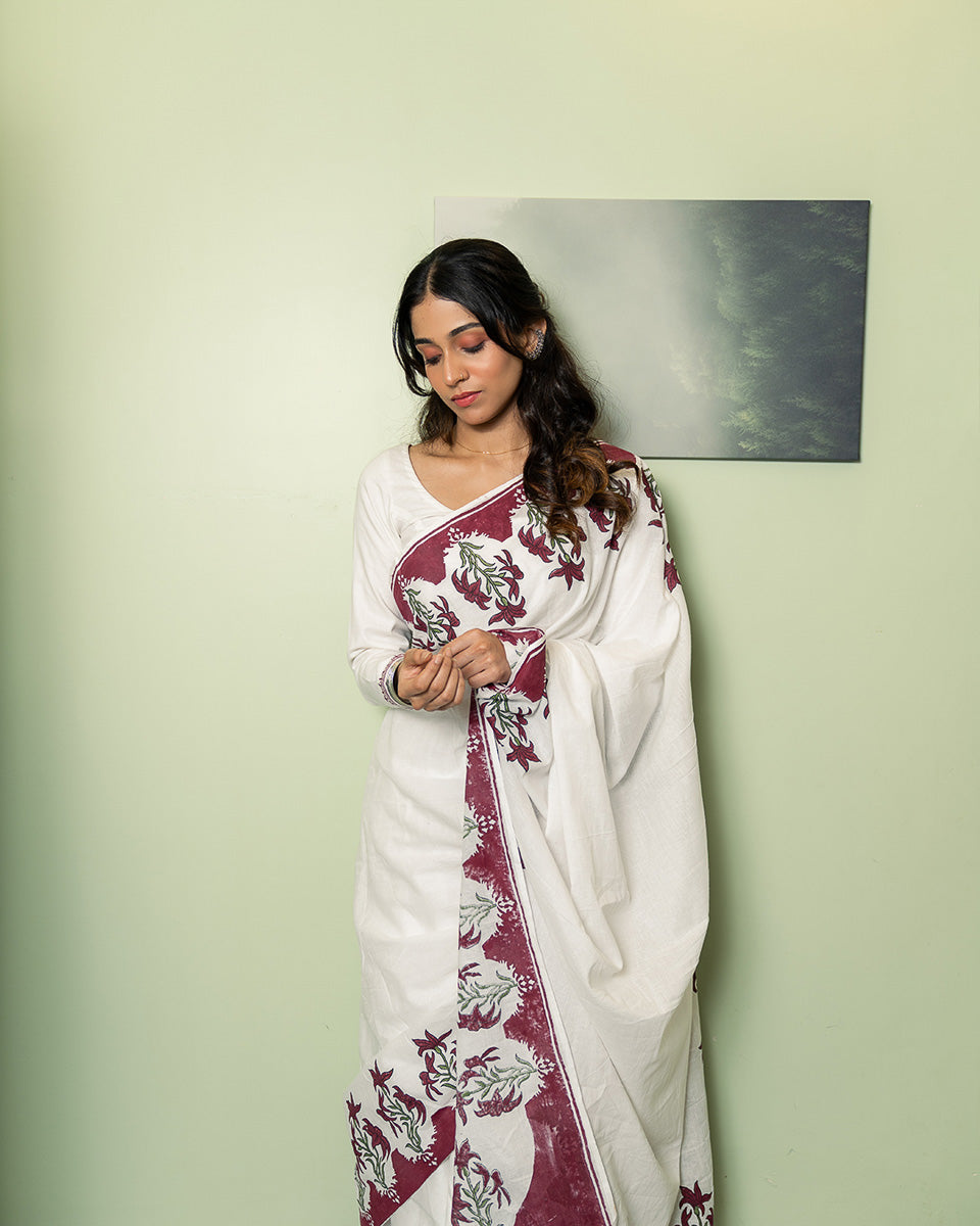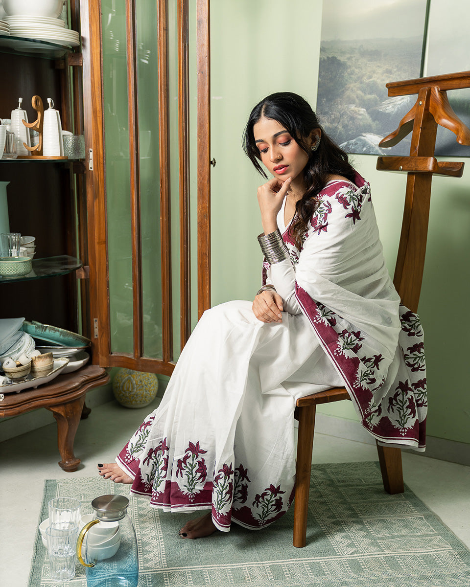 Crafted in semi cambric, this saree is light, breathable, and easy on the skin — perfect for daily wear while still holding a quiet elegance. Thoughtfully block printed, it’s designed for women who like their sarees effortless, wearable, and timeless.