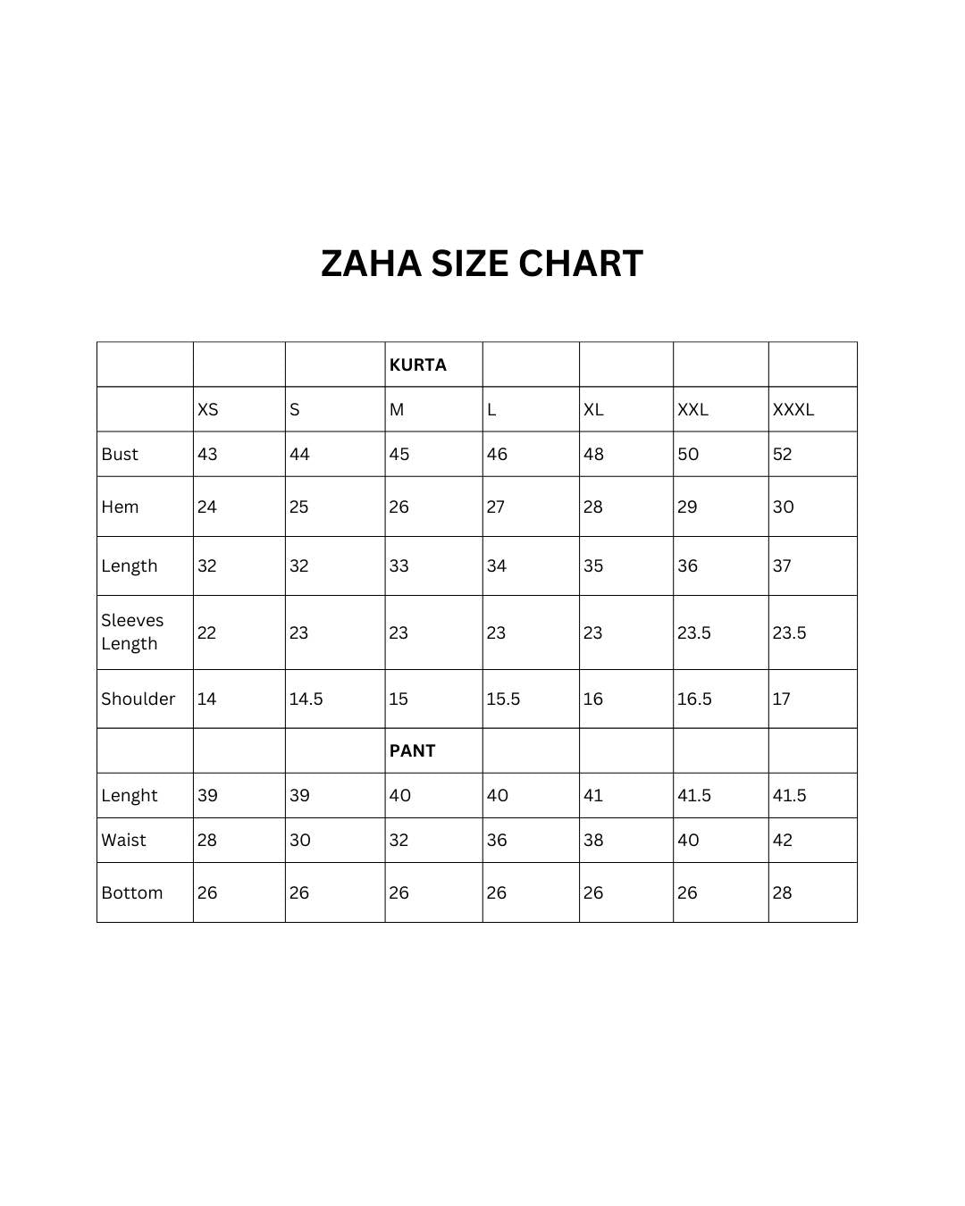 Note – Size chart is available on the last slide of photos
