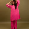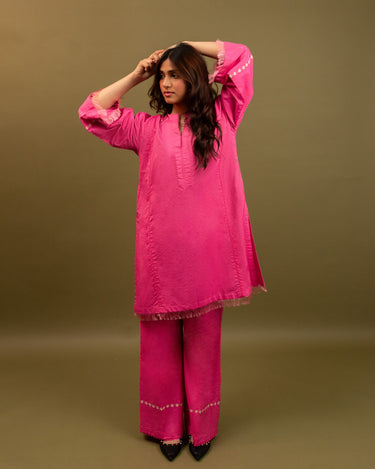 Rooh offers a hot pink Kurta and bell-bottom pants with lace detailing on panels, accompanied by minimal daisy embroidery and fringes on sleeves for a chic touch.