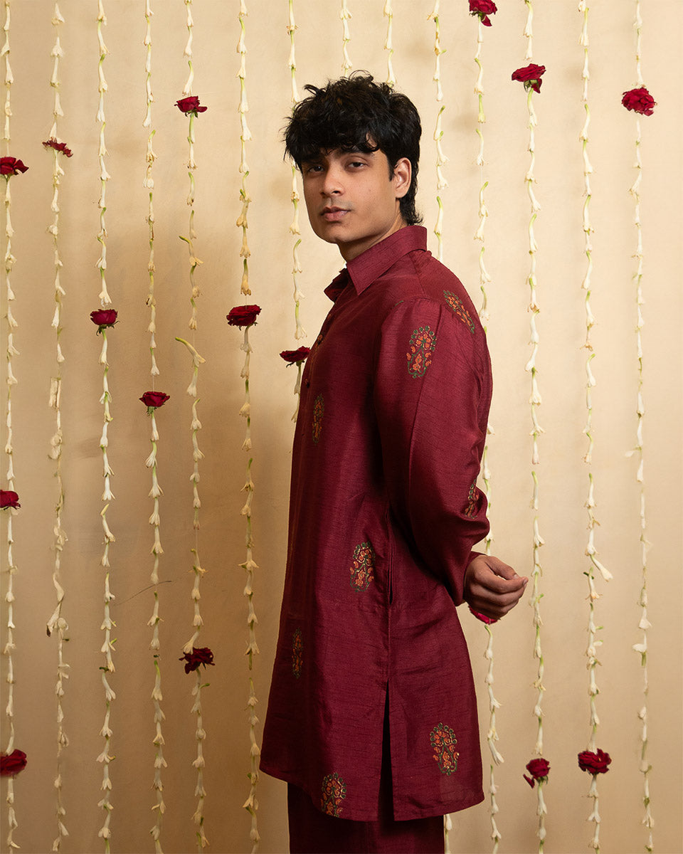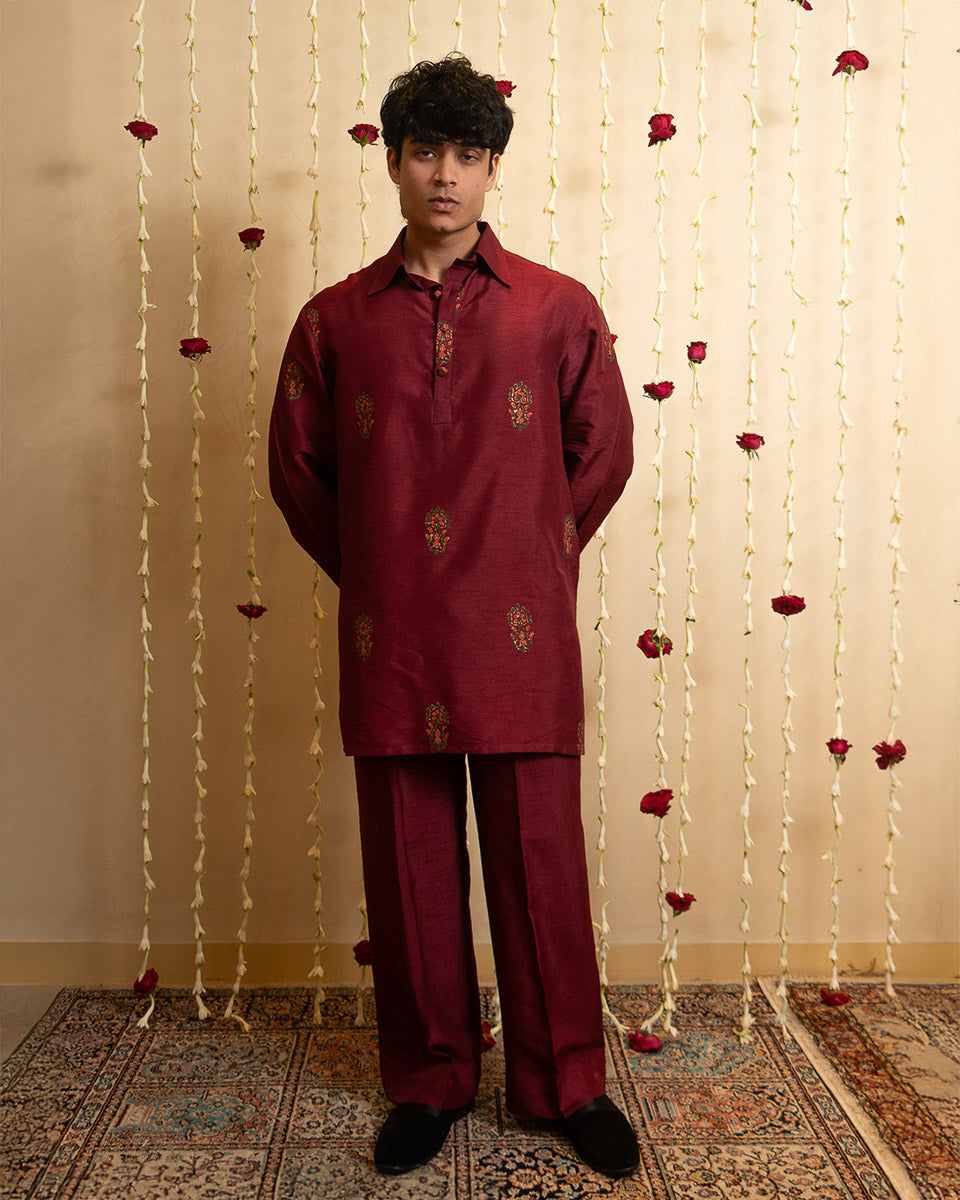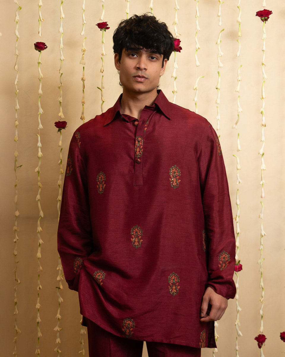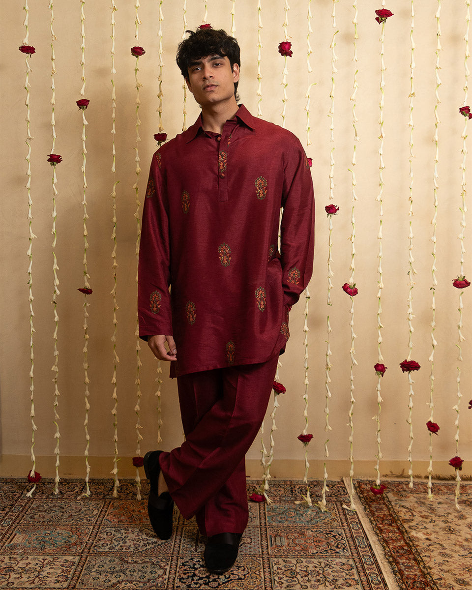 Shahmeer – An oversized hand-printed raw silk kurta in maroon red, styled with a classic shirt collar and flat fabric buttons, paired with straight-fit pants for an effortlessly refined look.