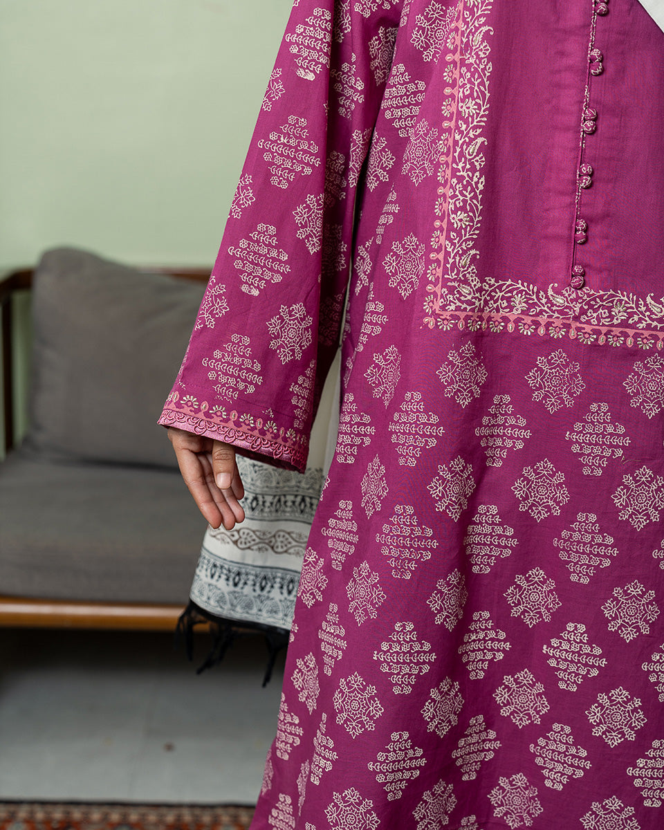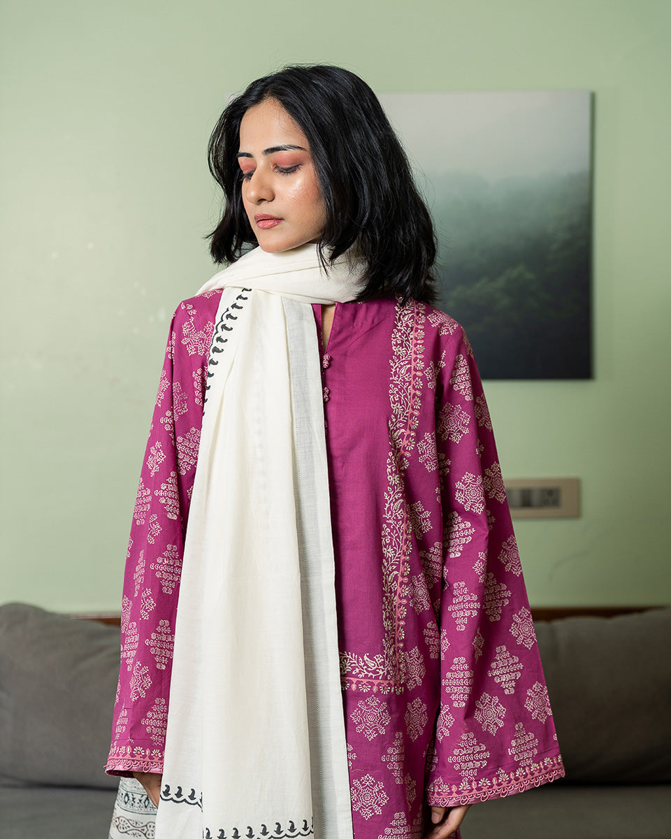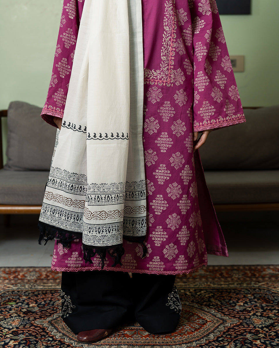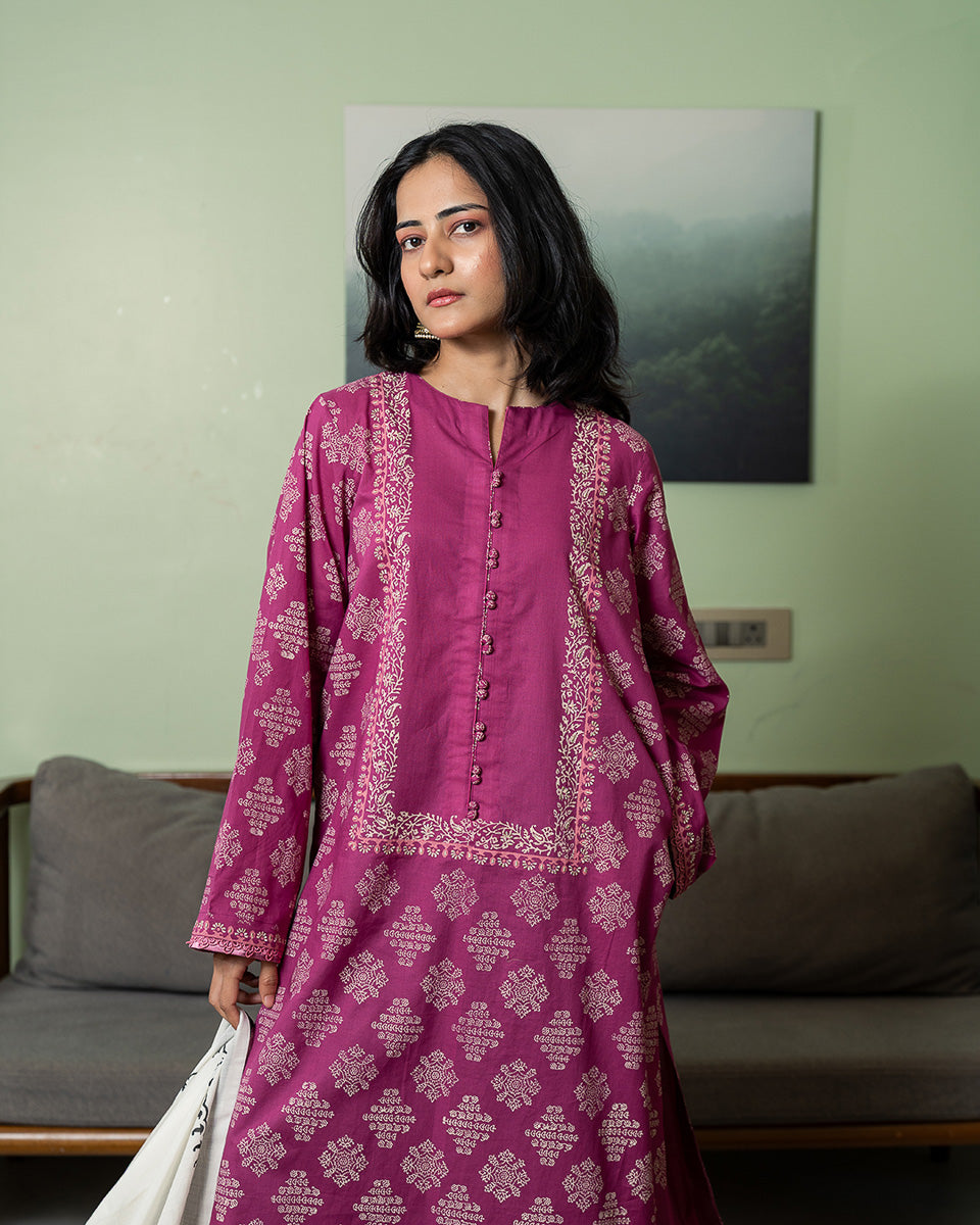 - Kurta: Pink cambric long kurta with light pink and Off white hand block print, straight sleeves, potli button neckline, zari embroidery highlight on neckline and sleeves, and satin finishing on sleeves, daaman, and slits.