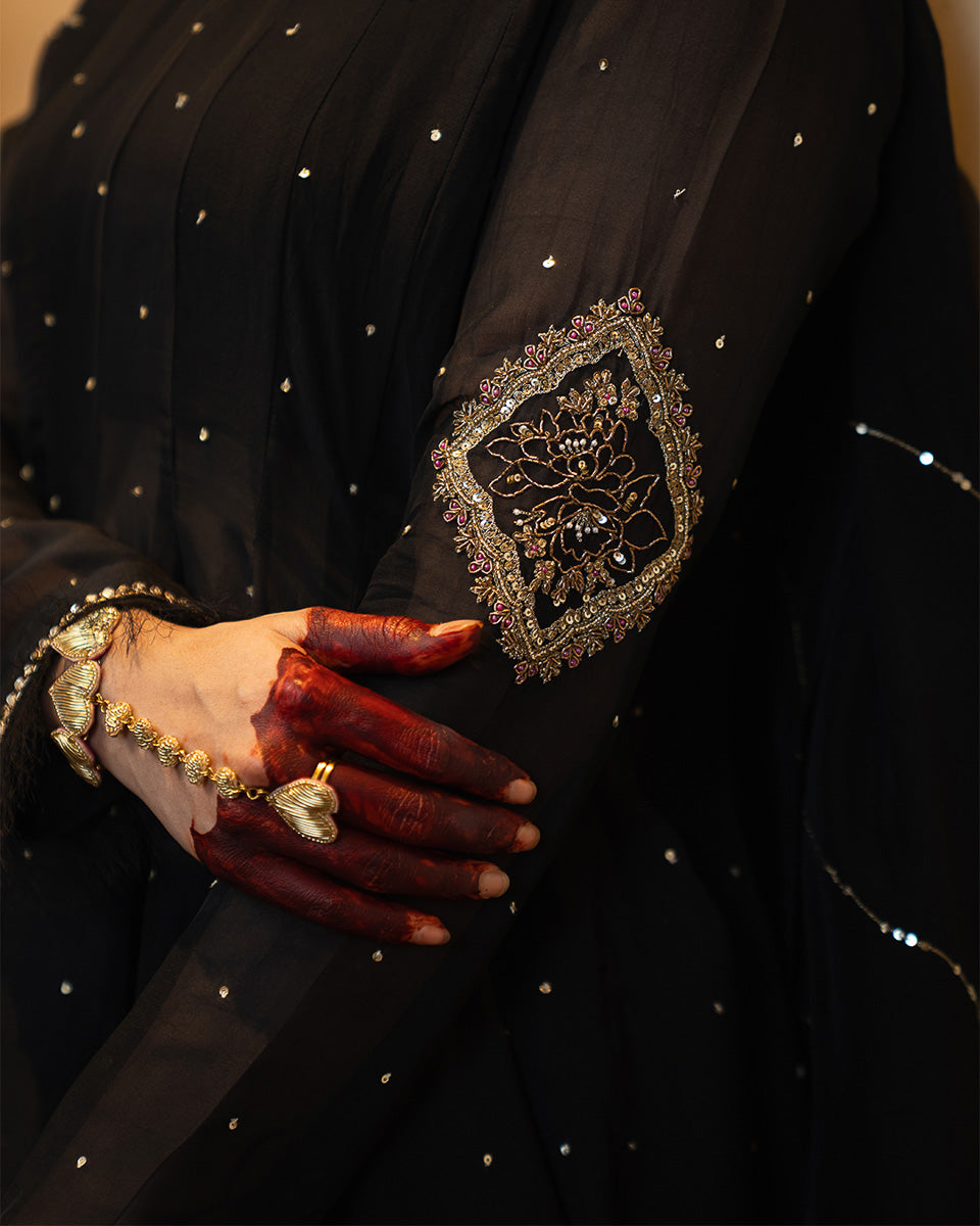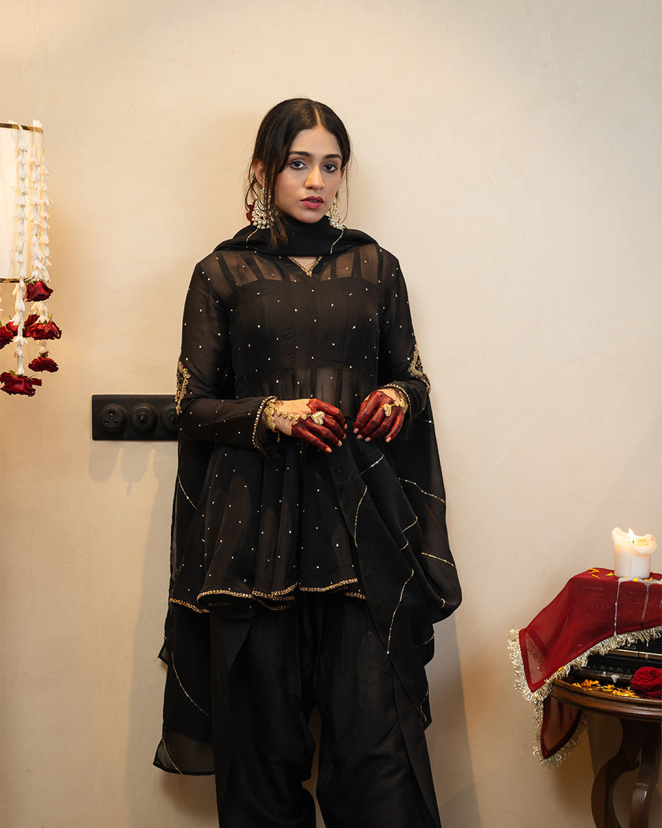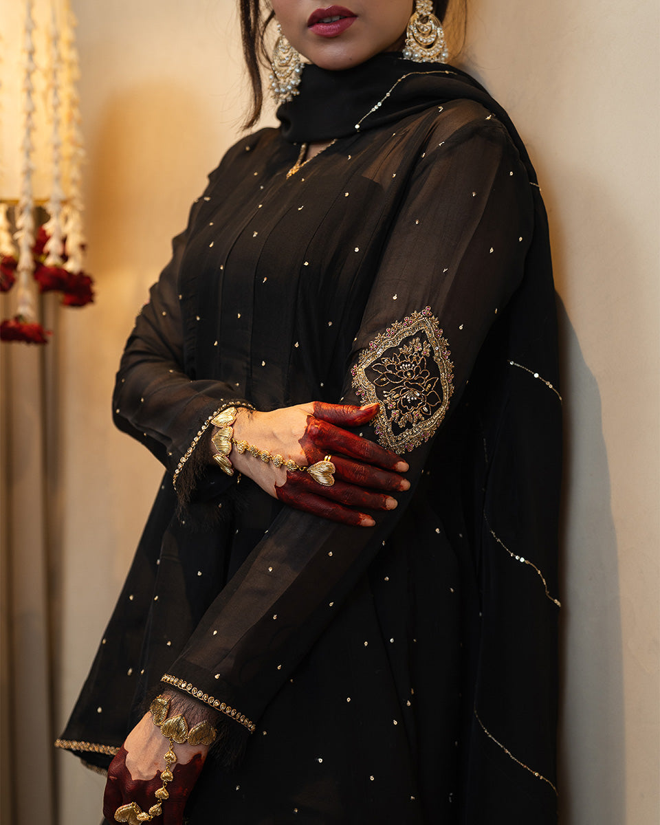 Afroz is crafted in sheer organza with 20 flowing kalis, creating a regal flare that moves beautifully. The sleeves feature detailed handworked motifs with soft pink hints, complemented by subtle all-over sequin work. Minimal detailed borders finish the neckline, sleeves, and hem for a refined festive look. It is paired with a raw silk inner, a traditional khadi Punjabi shalwar, and a handworked organza dupatta.