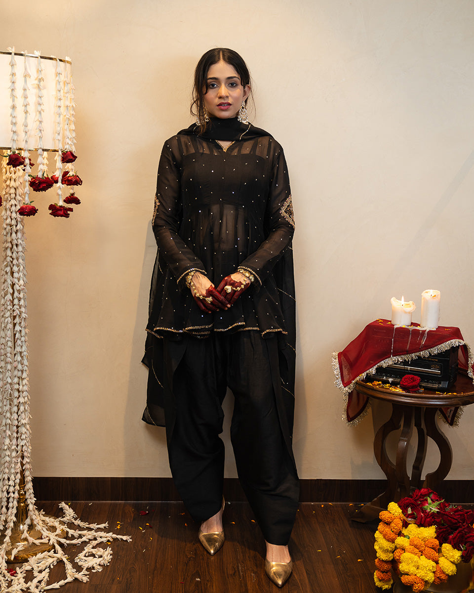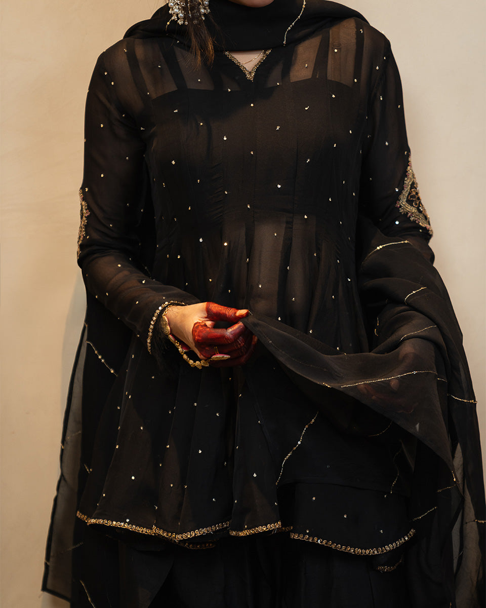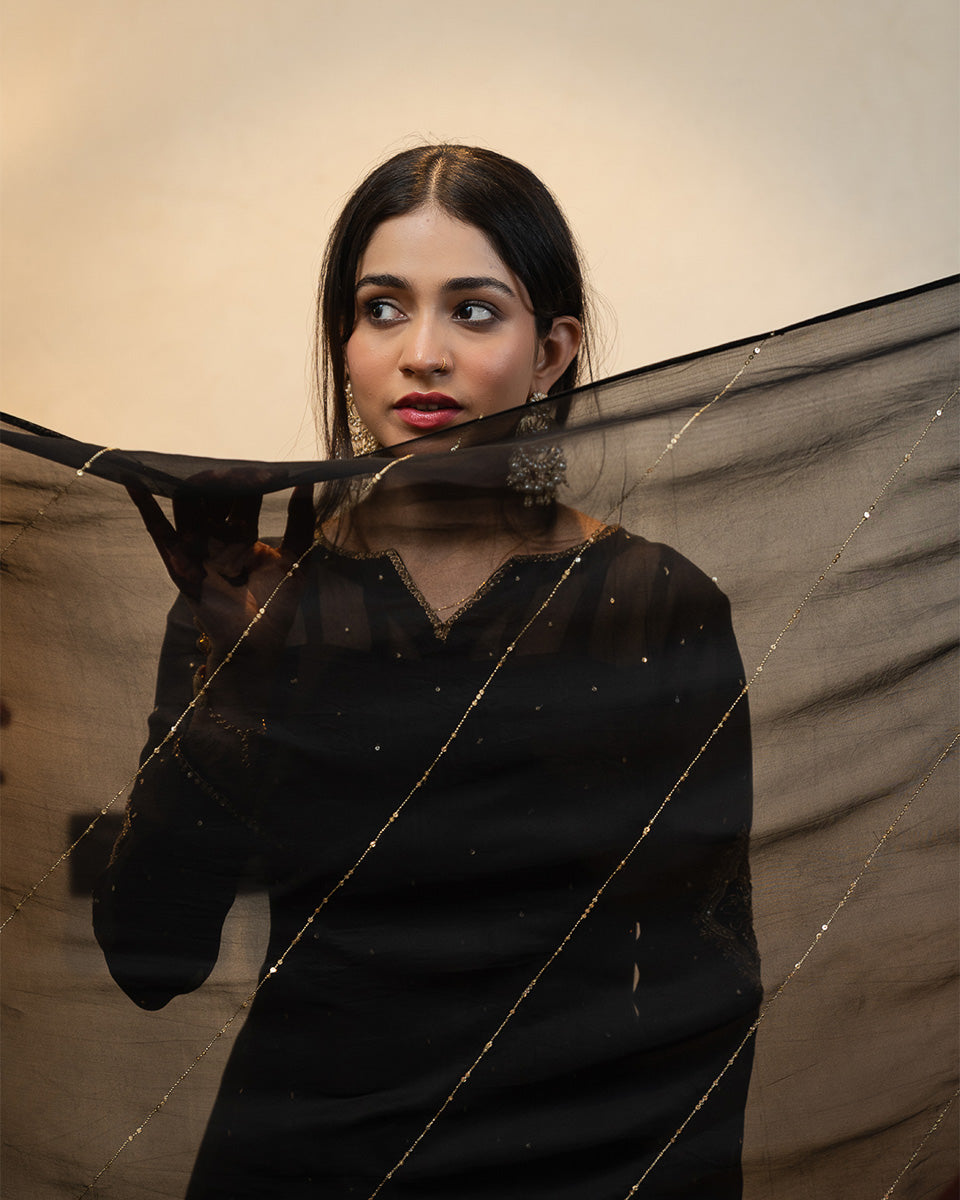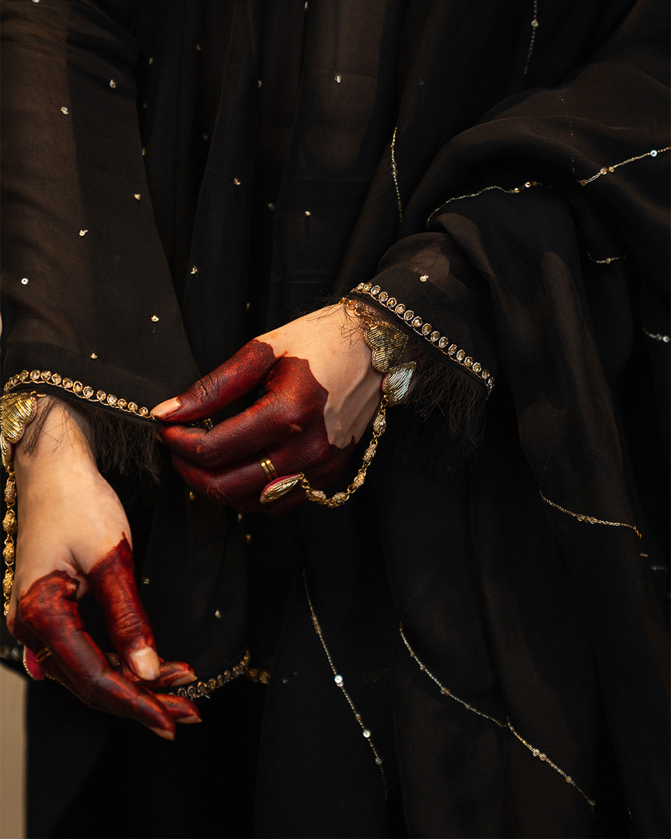Afroz is crafted in sheer organza with 20 flowing kalis, creating a regal flare that moves beautifully. The sleeves feature detailed handworked motifs with soft pink hints, complemented by subtle all-over sequin work. Minimal detailed borders finish the neckline, sleeves, and hem for a refined festive look. It is paired with a raw silk inner, a traditional khadi Punjabi shalwar, and a handworked organza dupatta.