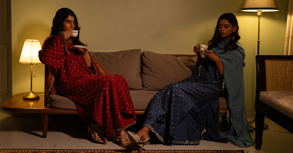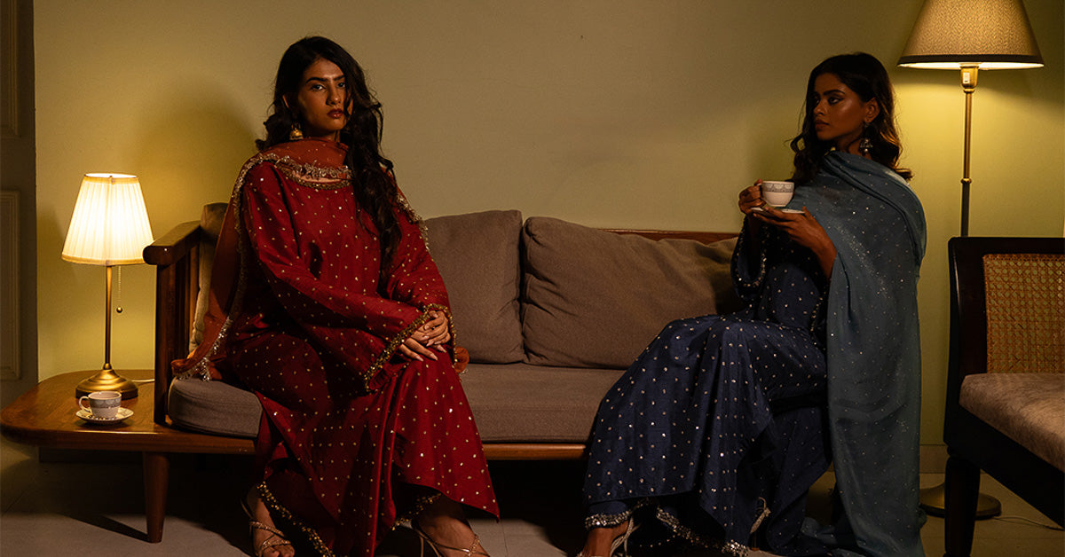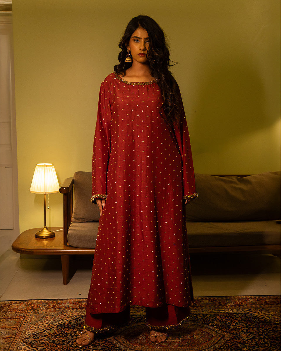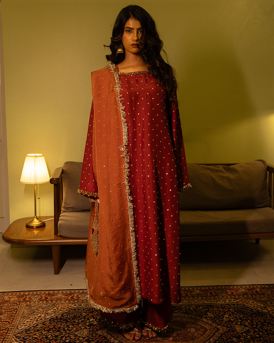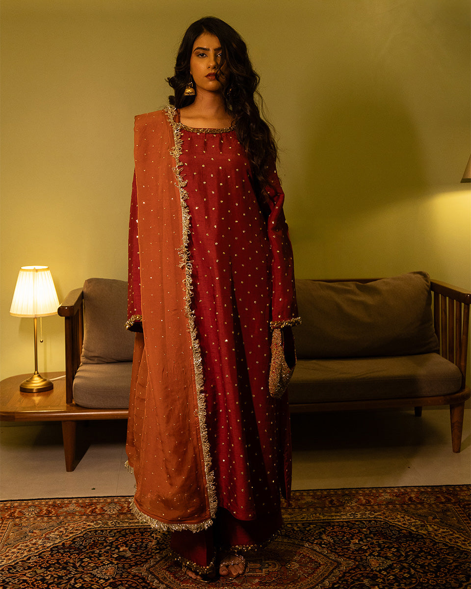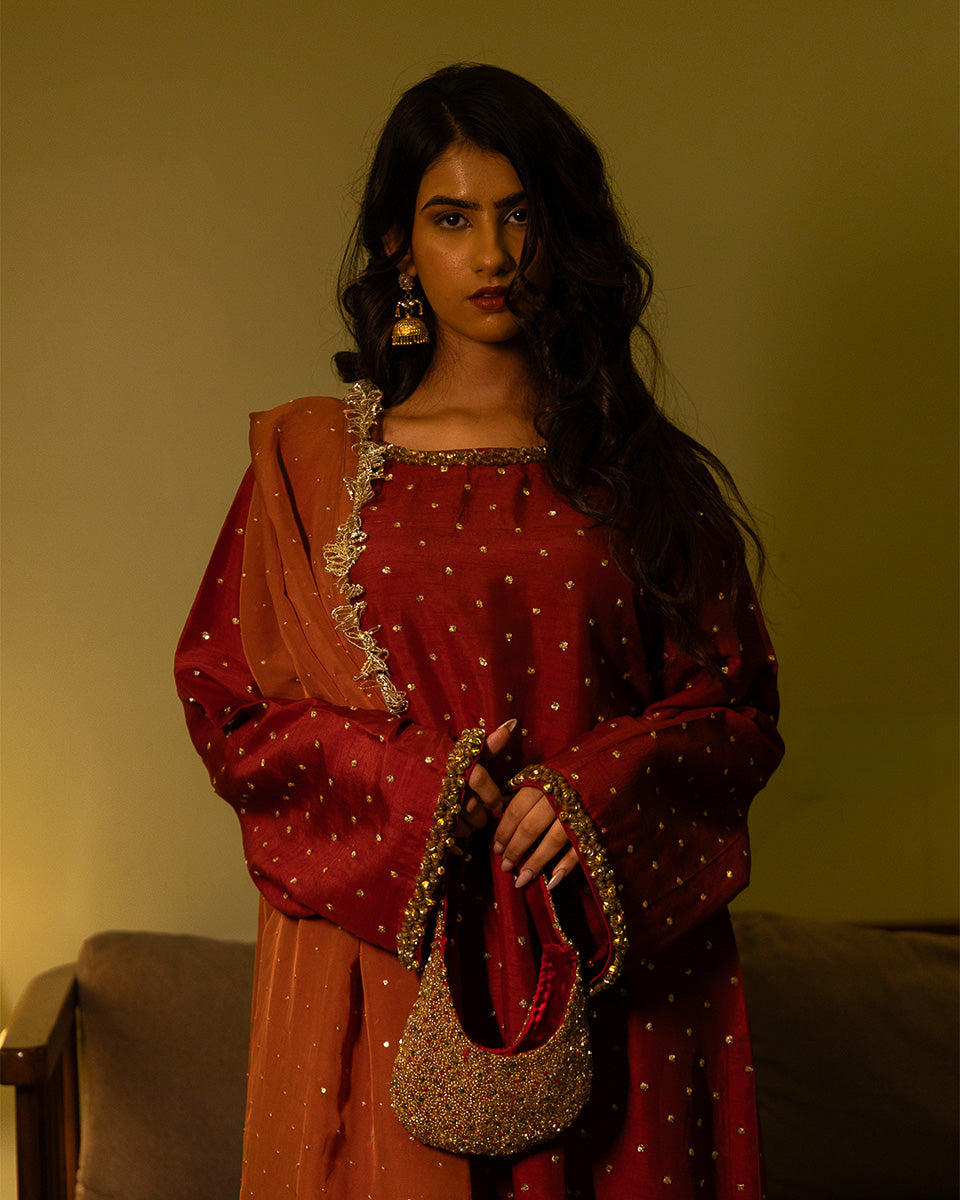 Thousands of sequins hand-stitched across the kurta front, back, and dupatta. The neckline, sleeves, and pant border are adorned with ghungroo and sequin bunches, carefully placed in a zig-zag pattern to create a striking 3D effect.