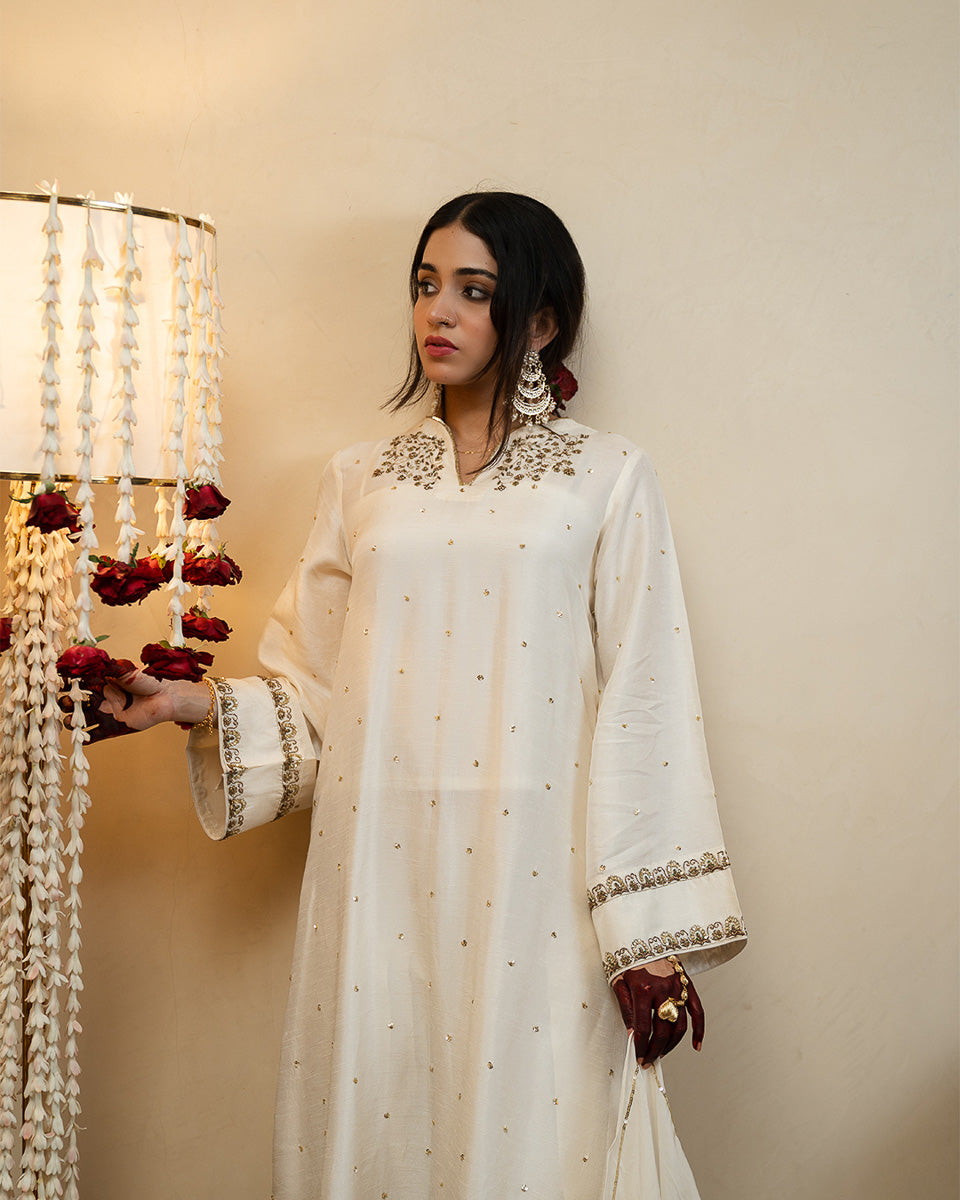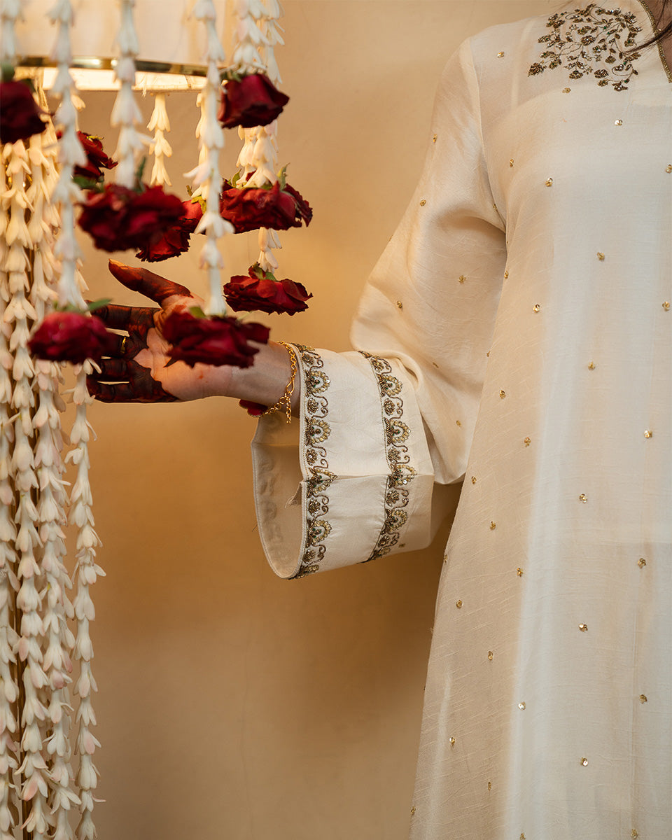 Gulfisha features a straight-fit long kurta in rich raw silk, paired with a classic farshi shalwar for an elongated, graceful silhouette. The kurta is adorned with detailed handworked motifs on the neckline and a finely crafted handwork border on the sleeves. Delicate hand-embellished sequins are scattered across the front and back, adding a soft festive shimmer.