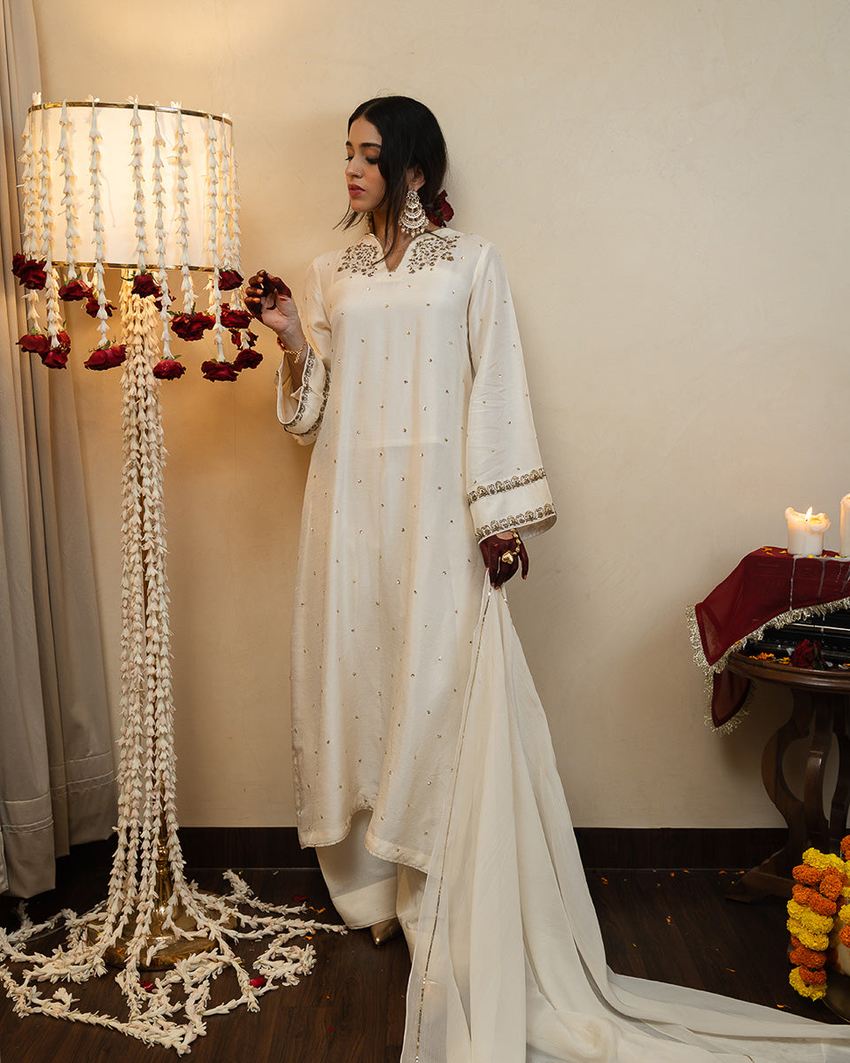 Fabric: Raw Silk Kurta, Farshi Shalwar, Organza Dupatta