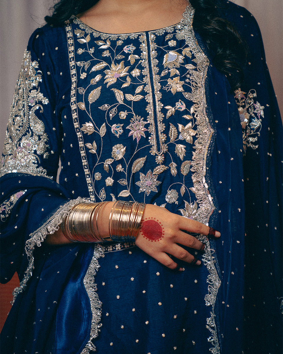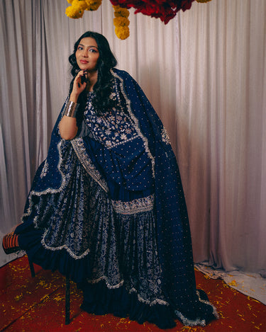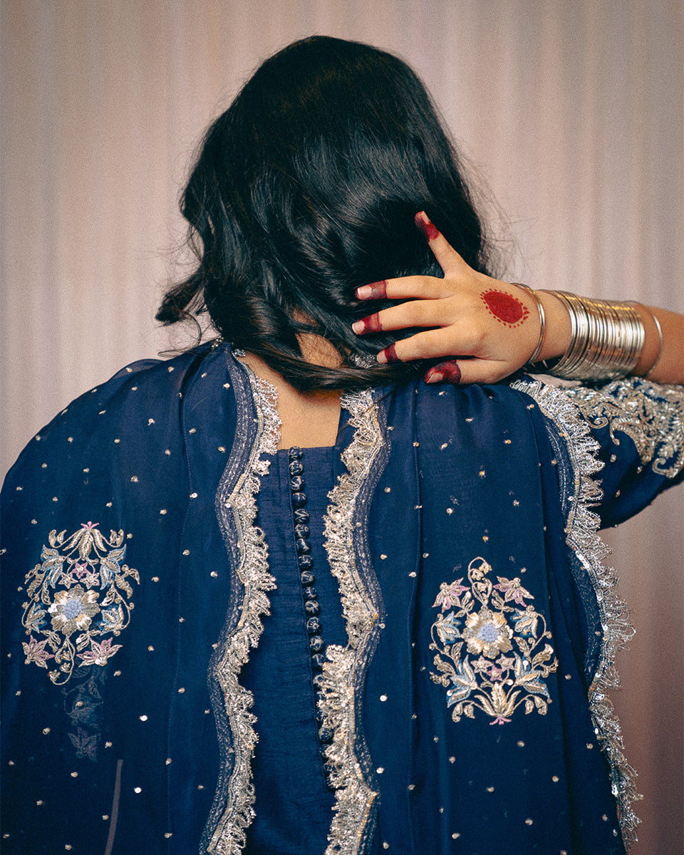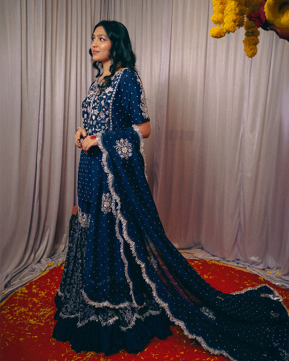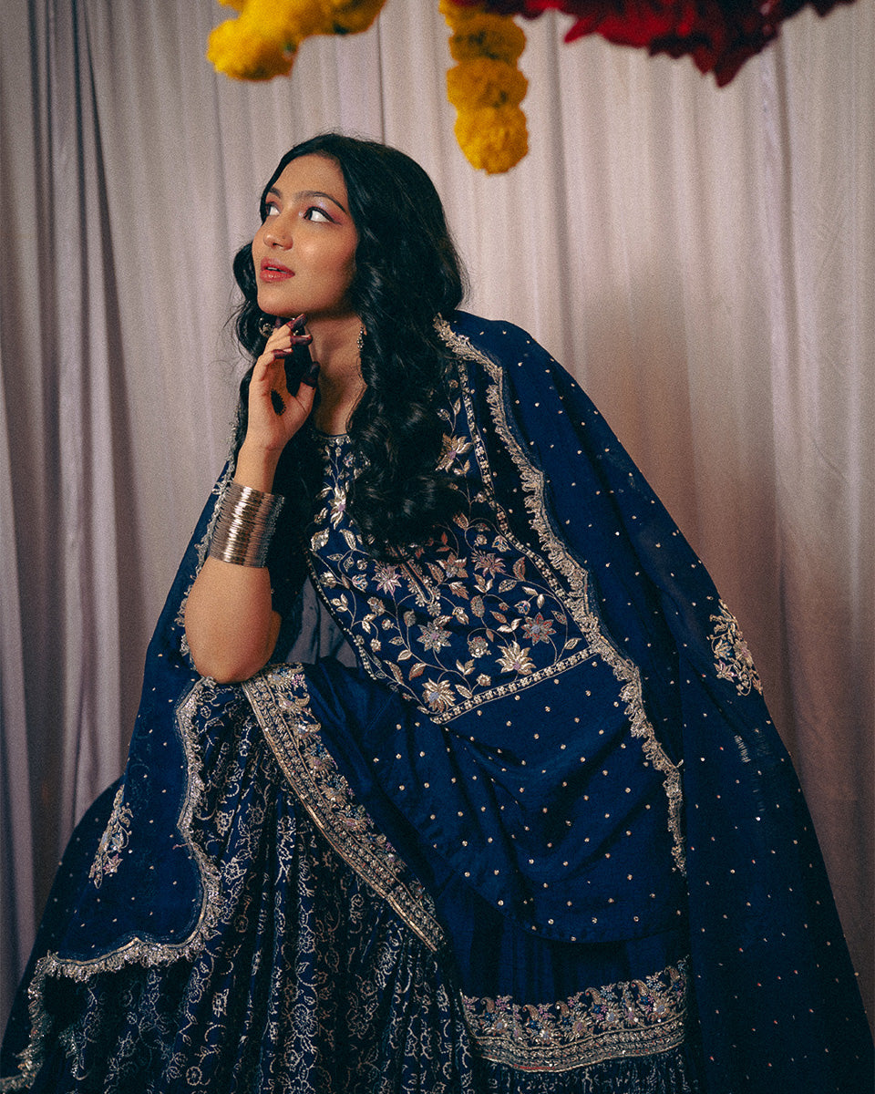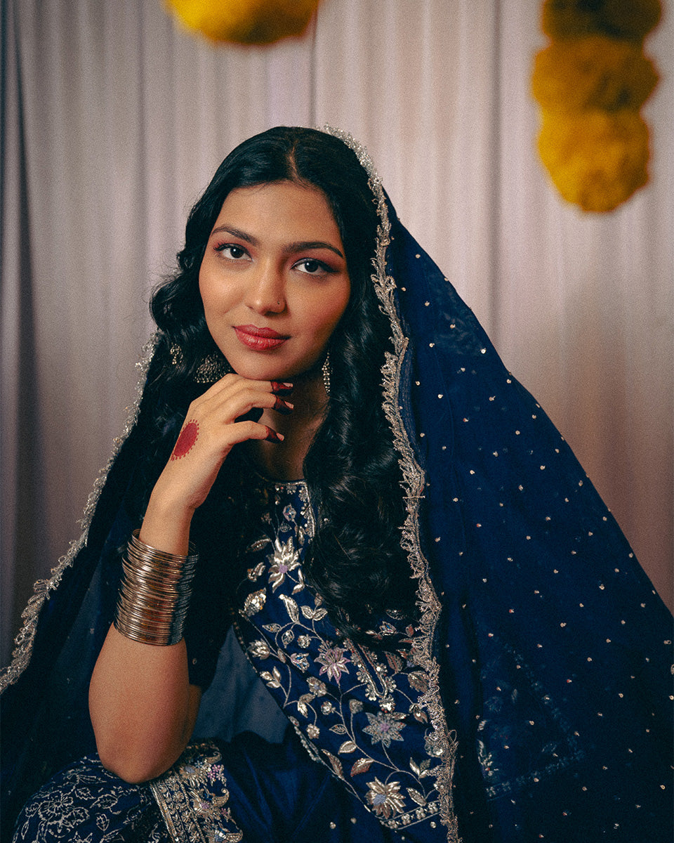 An ode to timeless grace, Noor Jahan revives the elegance of the bygone era — a tribute to the silhouettes worn by women in the ’60s and ’70s. This midnight blue ensemble captures the essence of old-world charm with its traditional 8-meter ghera gharara, a style few still craft today.