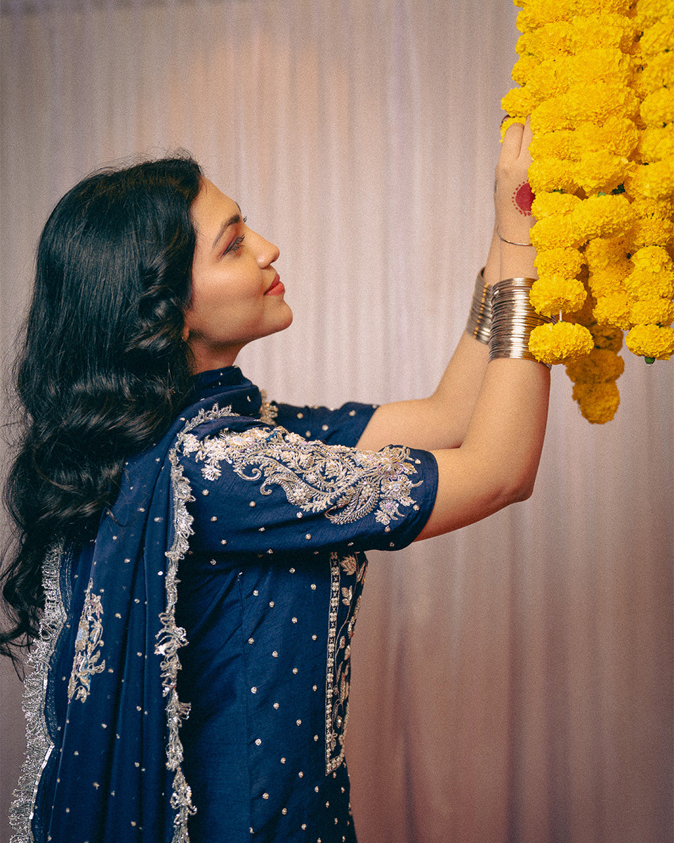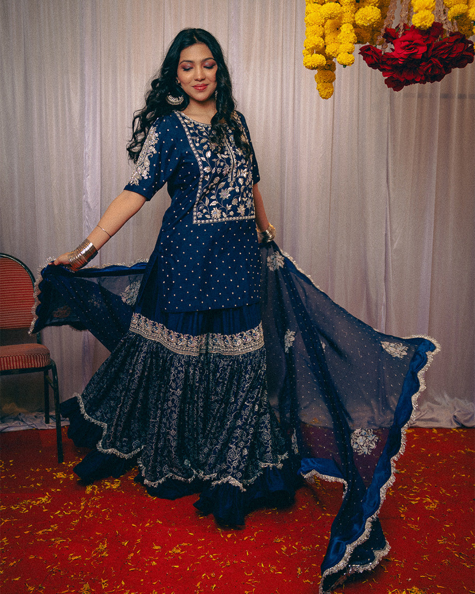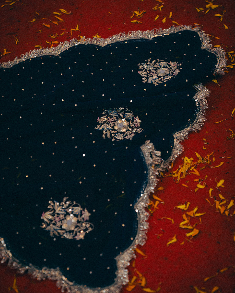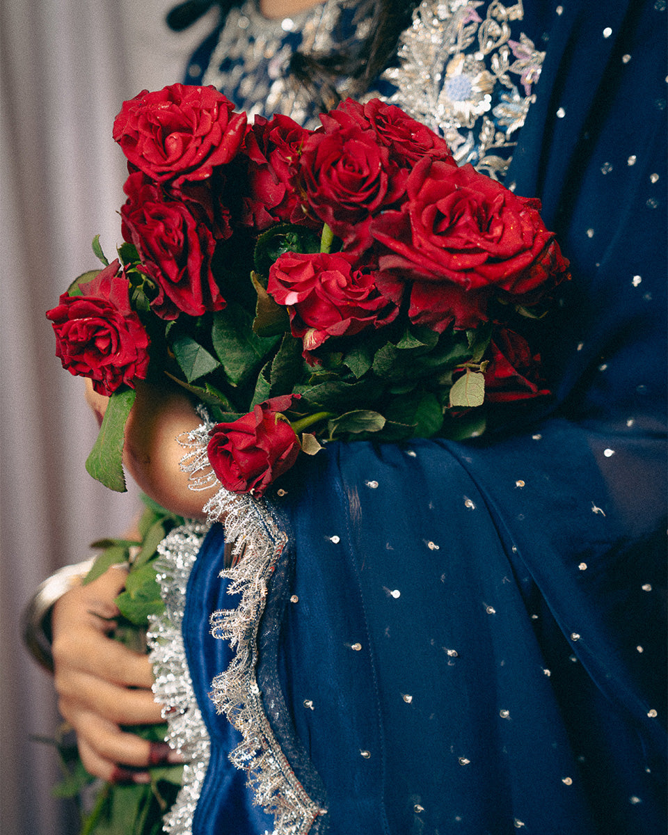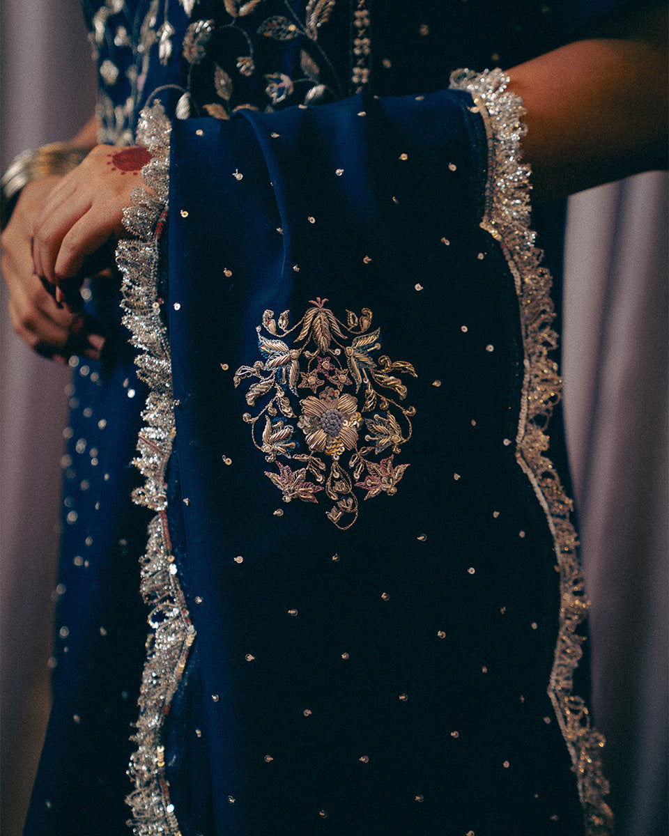 An ode to timeless grace, Noor Jahan revives the elegance of the bygone era — a tribute to the silhouettes worn by women in the ’60s and ’70s. This midnight blue ensemble captures the essence of old-world charm with its traditional 8-meter ghera gharara, a style few still craft today.