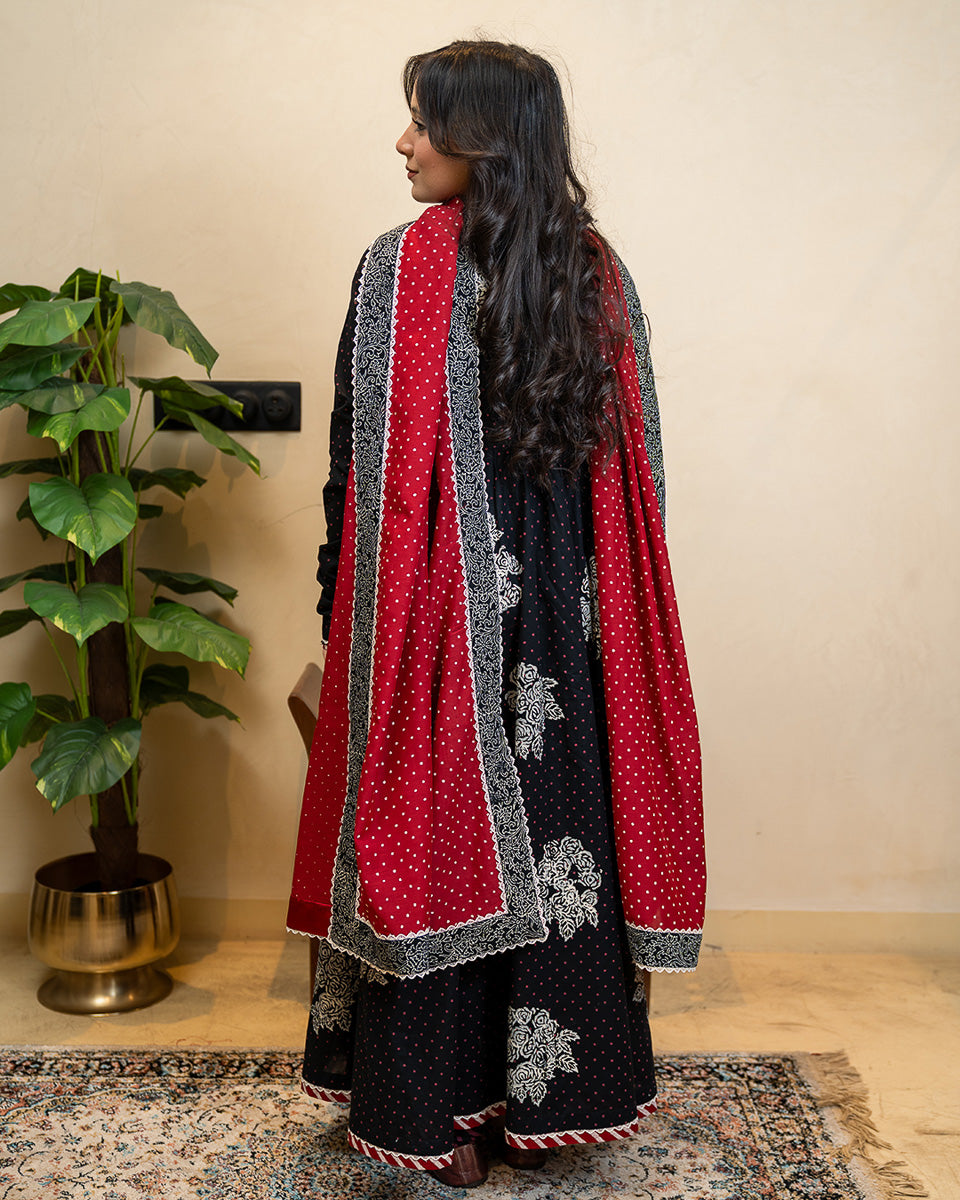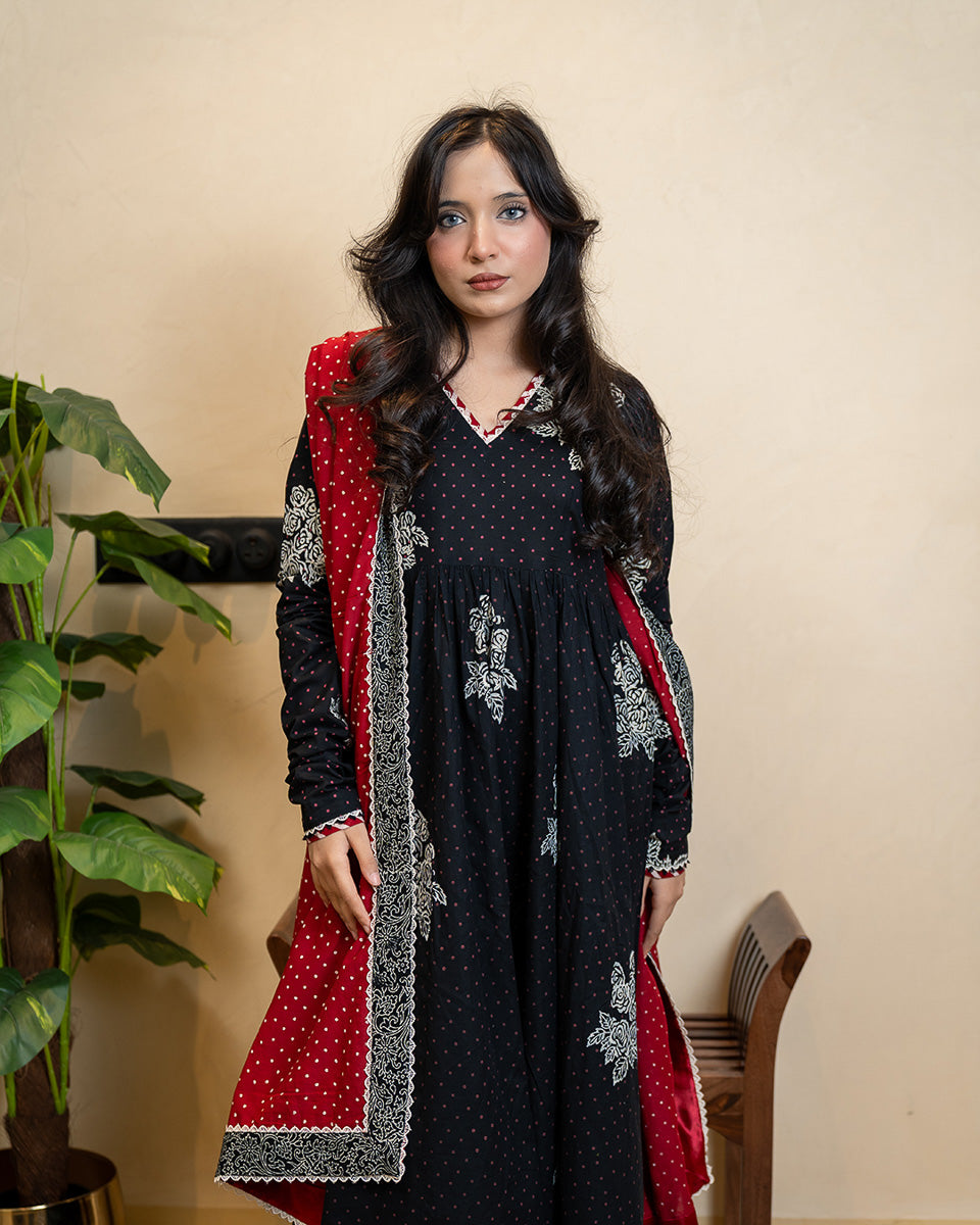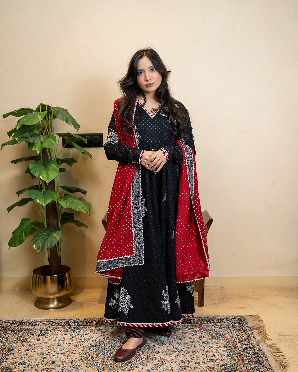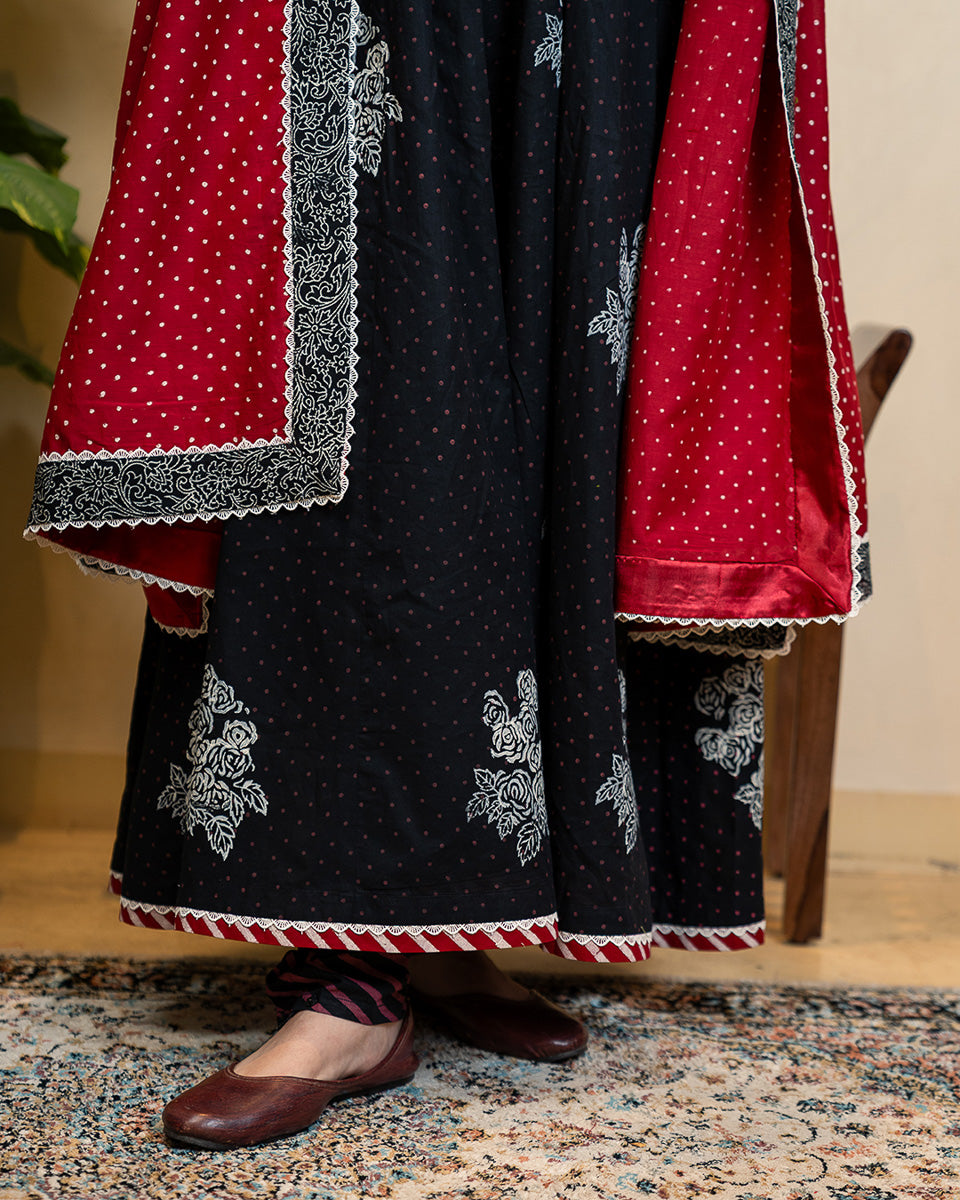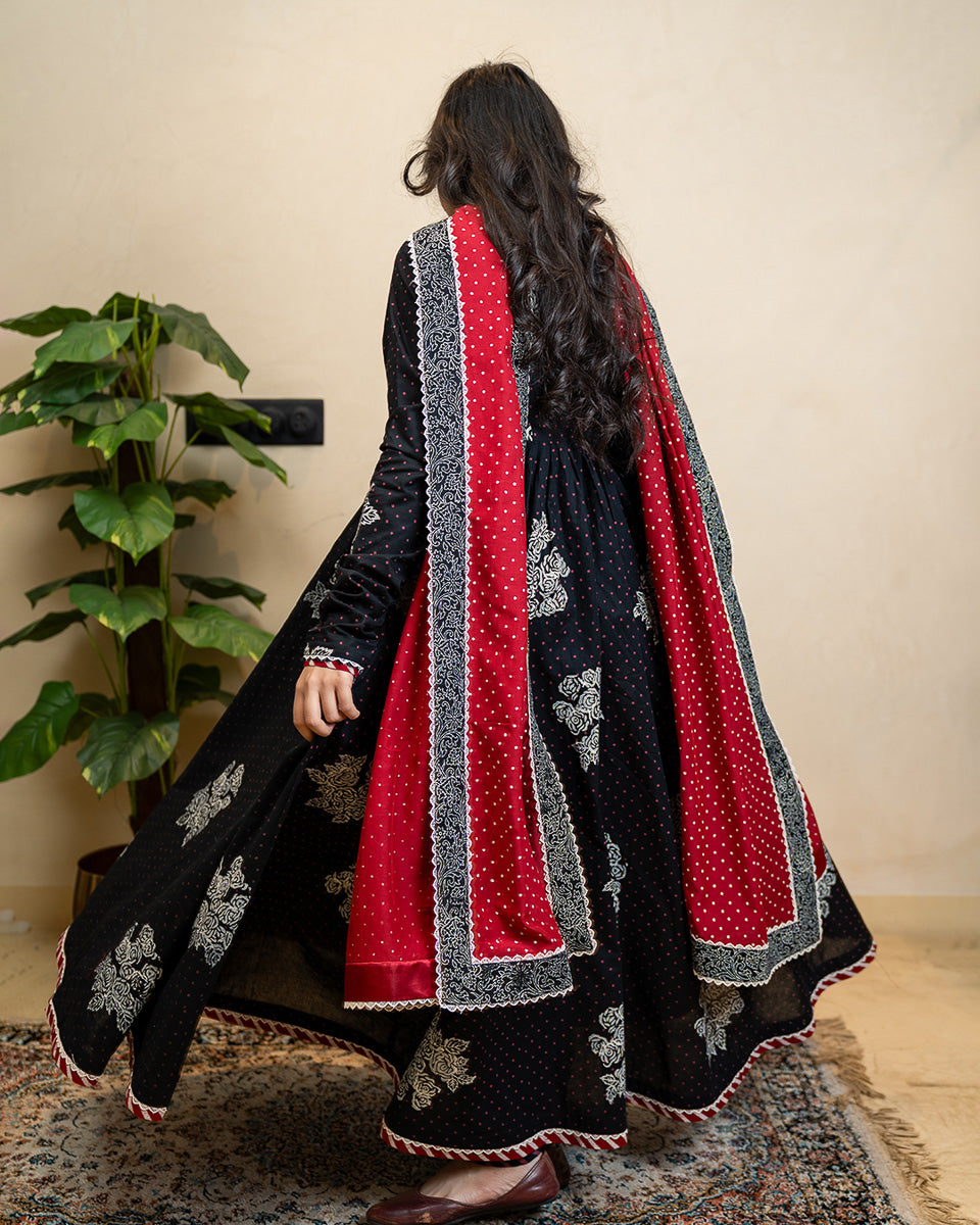 A classic black Anarkali, handcrafted with quiet drama and intricate detailing. Made in soft cambric, this long Anarkali features 16 flowing kalis that create a graceful flare with every step. The silhouette is elevated with fitted chudidaar sleeves, finished with double lace detailing, delicate fringes, and hints of red chatapati along the sleeves and daaman. The V-neckline is thoughtfully highlighted with red chatapati accents and lace work, adding contrast to the deep black base. Paired with a matching cambric chudidaar, the look is completed with a Swiss voile dupatta featuring satin finishing, lace edges, and block-printed borders for a refined finish. A timeless piece designed for evenings, festivities, and moments that call for understated elegance.