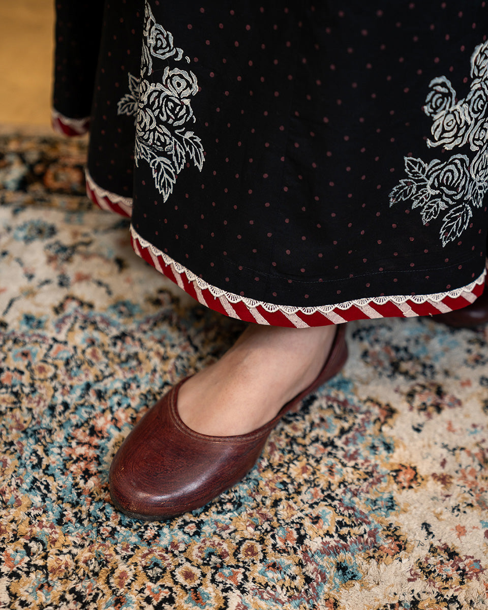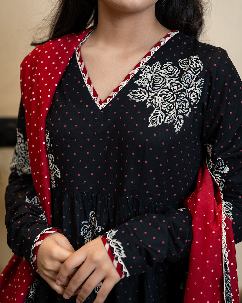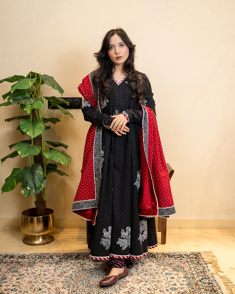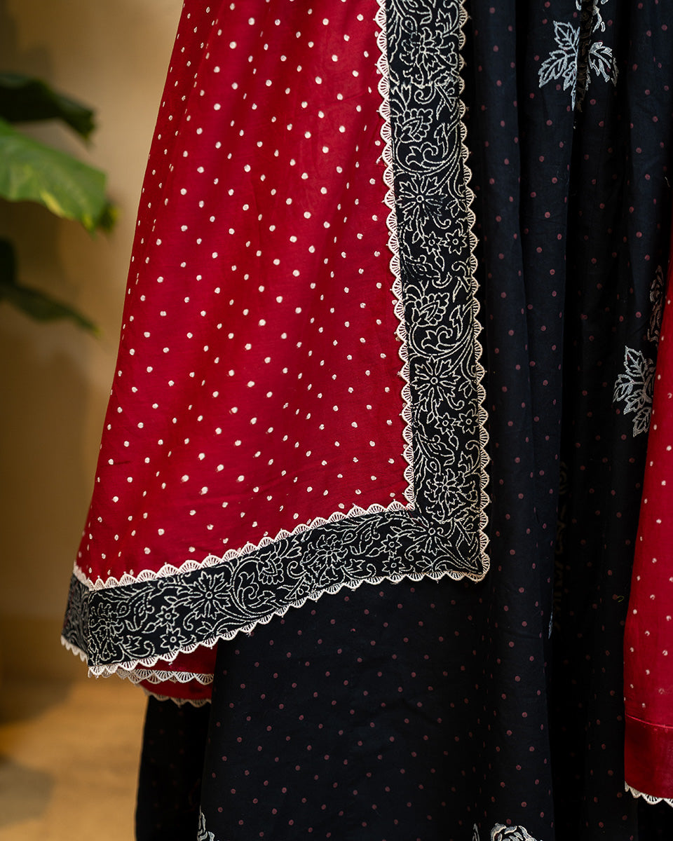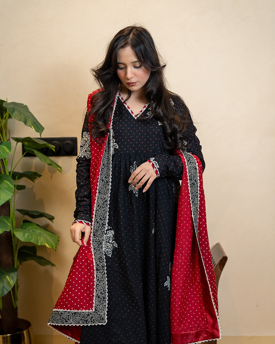 A classic black Anarkali, handcrafted with quiet drama and intricate detailing. Made in soft cambric, this long Anarkali features 16 flowing kalis that create a graceful flare with every step. The silhouette is elevated with fitted chudidaar sleeves, finished with double lace detailing, delicate fringes, and hints of red chatapati along the sleeves and daaman. The V-neckline is thoughtfully highlighted with red chatapati accents and lace work, adding contrast to the deep black base. Paired with a matching cambric chudidaar, the look is completed with a Swiss voile dupatta featuring satin finishing, lace edges, and block-printed borders for a refined finish. A timeless piece designed for evenings, festivities, and moments that call for understated elegance.