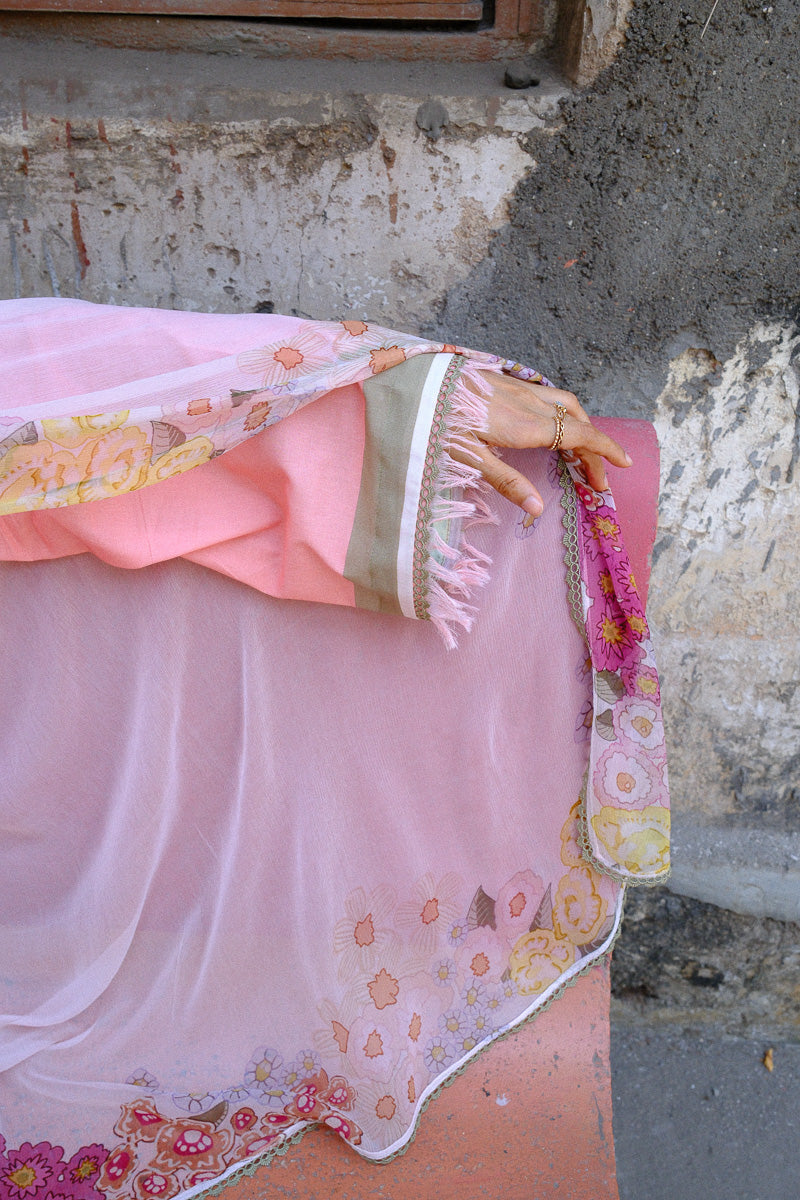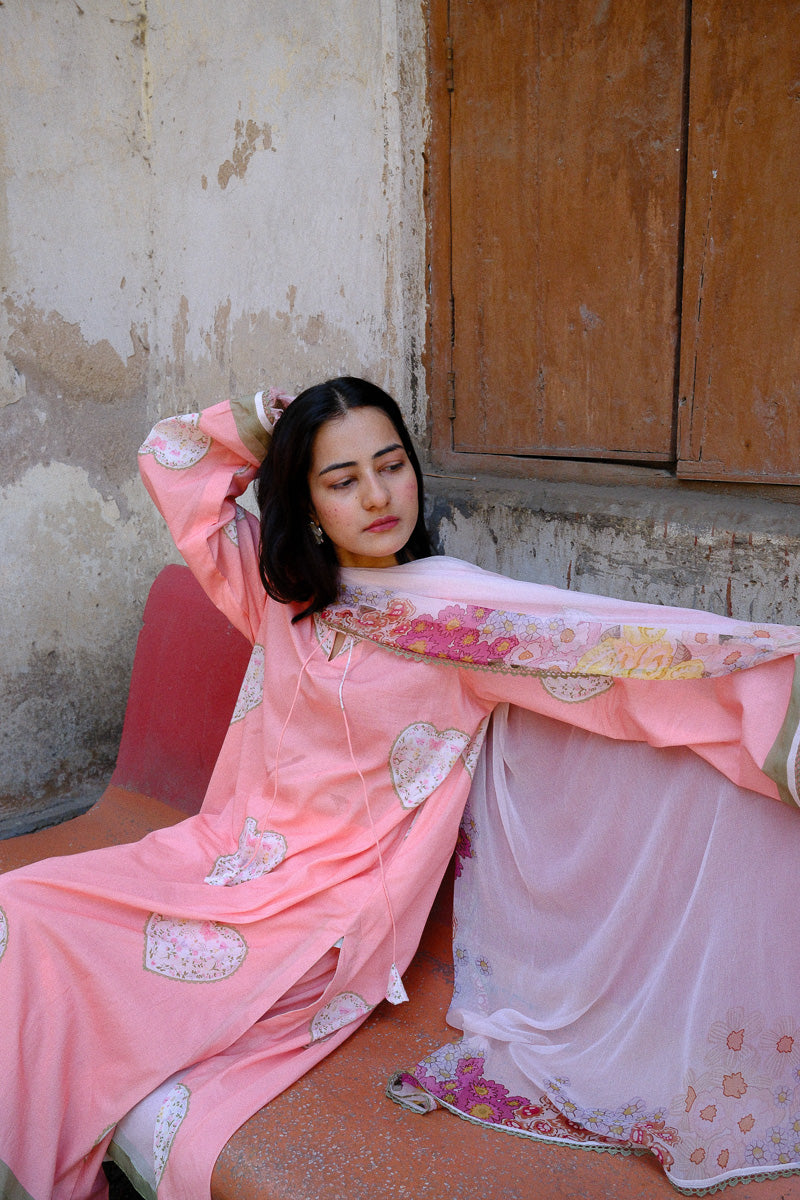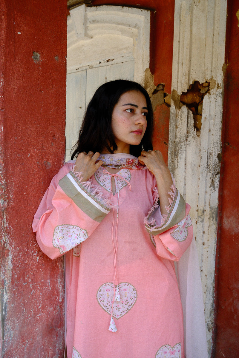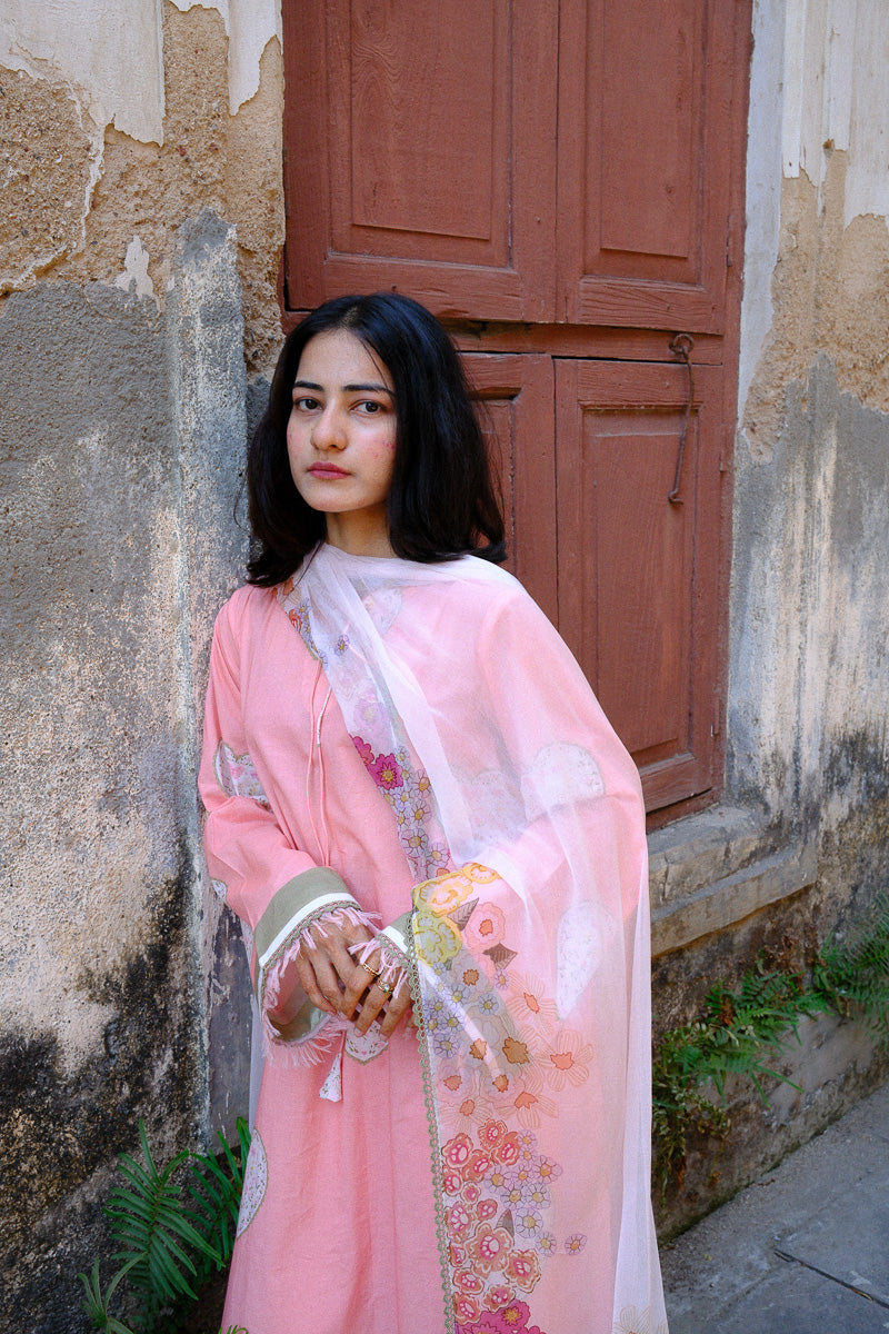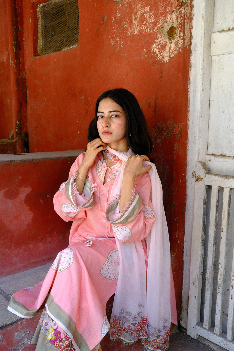 Serin, a soft pink expression, shaped in a flowing A-line silhouette. The long printed kurta is finished with lace and satin detailing along the sleeves and daaman, with delicate fringes adding a gentle movement. A V-neckline with lace and dori detail brings in a hint of intricacy.