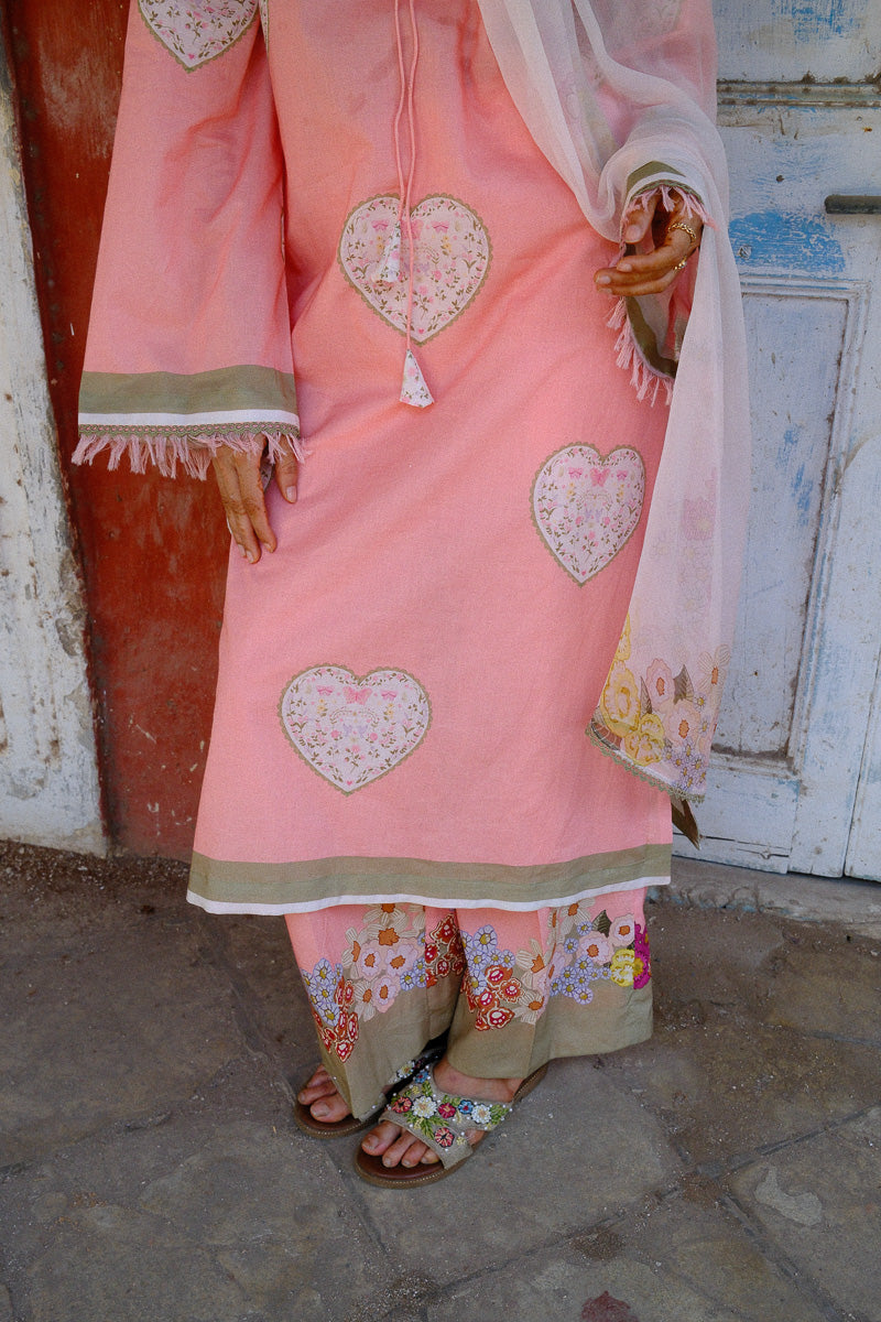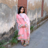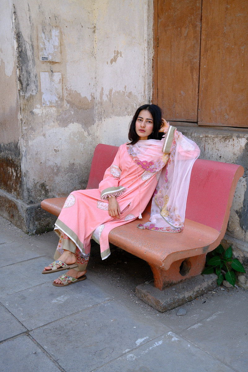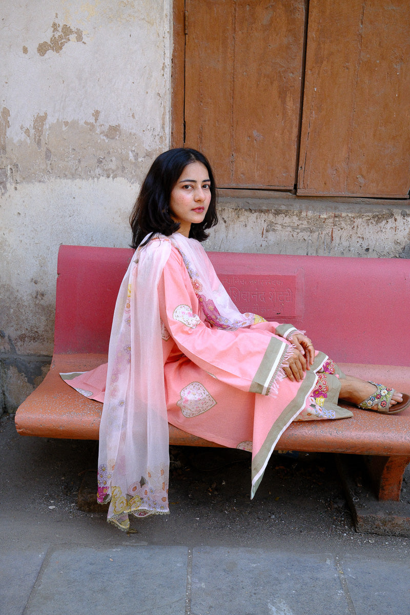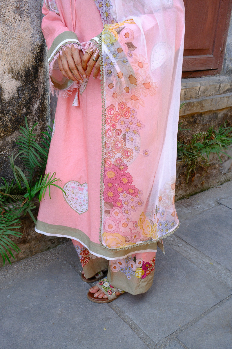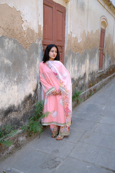 Serin, a soft pink expression, shaped in a flowing A-line silhouette. The long printed kurta is finished with lace and satin detailing along the sleeves and daaman, with delicate fringes adding a gentle movement. A V-neckline with lace and dori detail brings in a hint of intricacy.