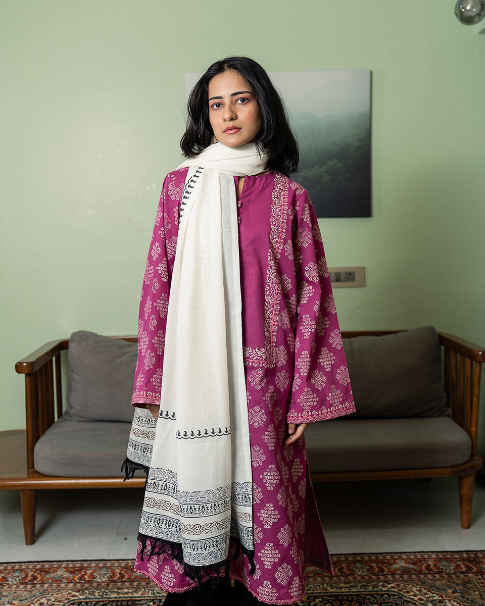 - Dupatta: Hand block printed Swiss voile dupatta (2.5 mtrs) with satin finishing on all four sides and fringes on the pallu.