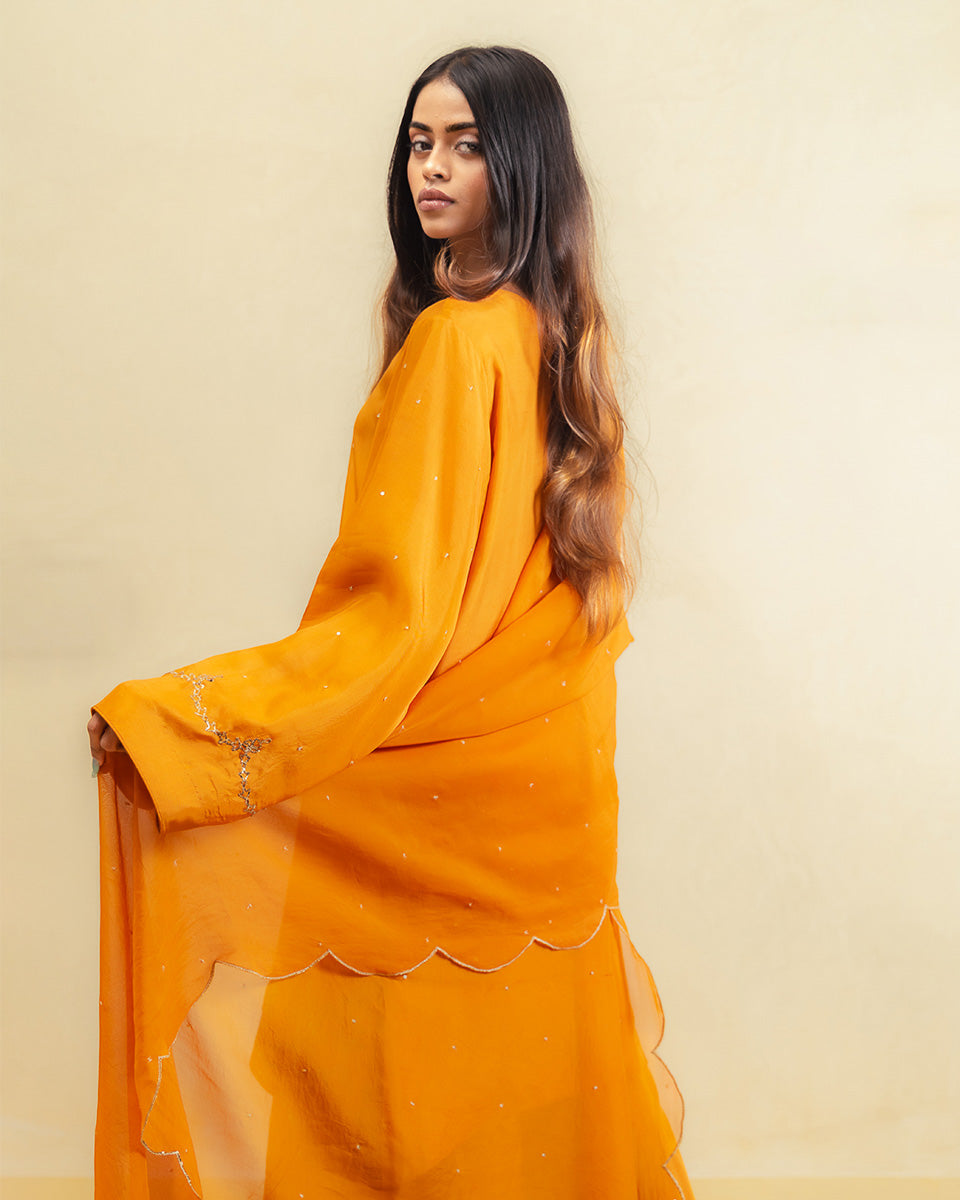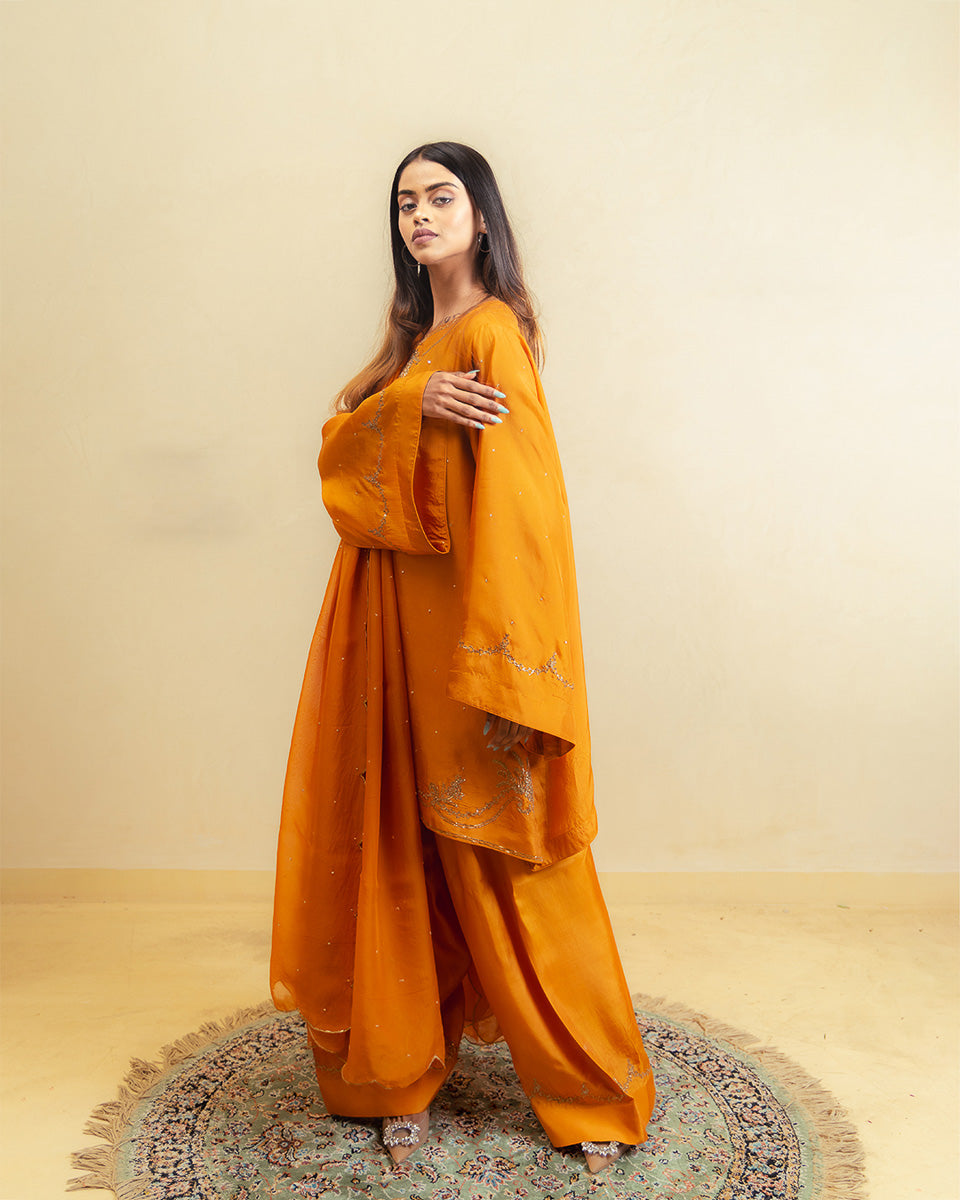 Zard - A rust silk short kameez and farshi shalwar, paired with a delicate organza dupatta. Zard is a nod to old-school glamour with a quiet kind of boldness.