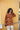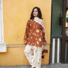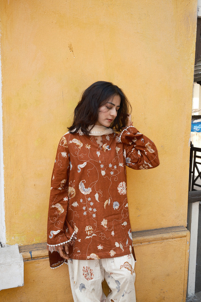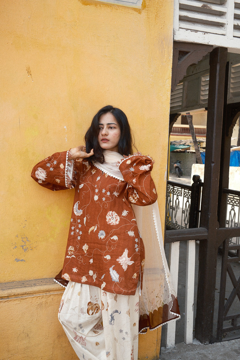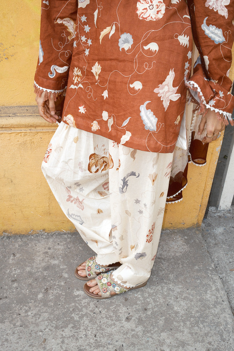Zimal, a rustic brown palette, softened with off-white and gentle prints. The short kurta is detailed with satin finishing along the sleeves and hem, with lace and fringes adding texture and movement. The neckline is adorned with delicate potli buttons and loops, bringing a touch of old-world charm.
