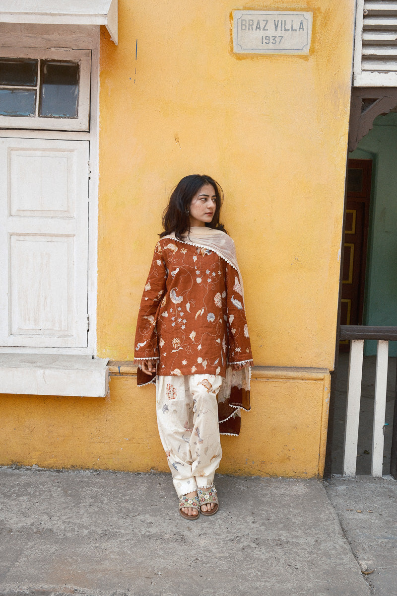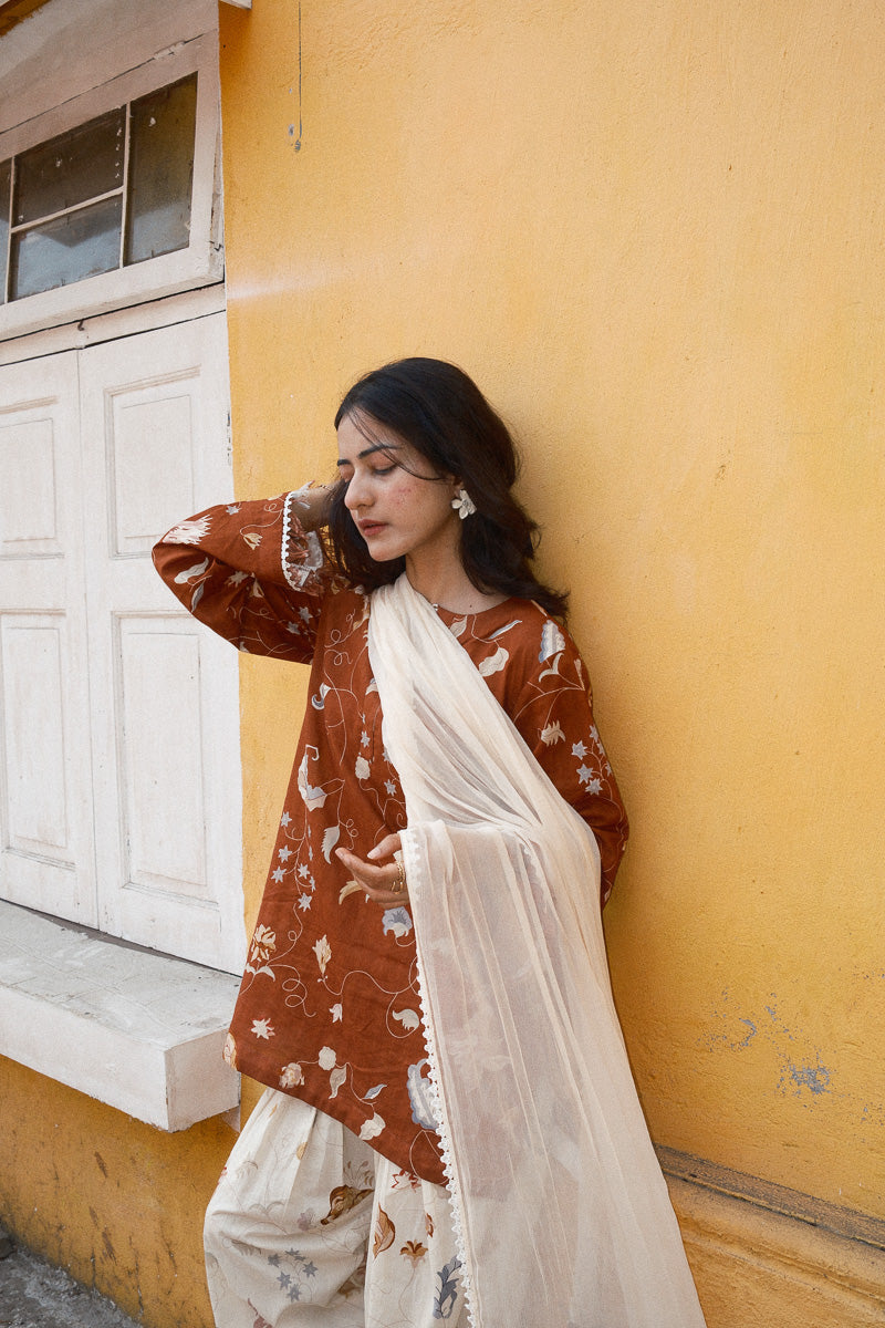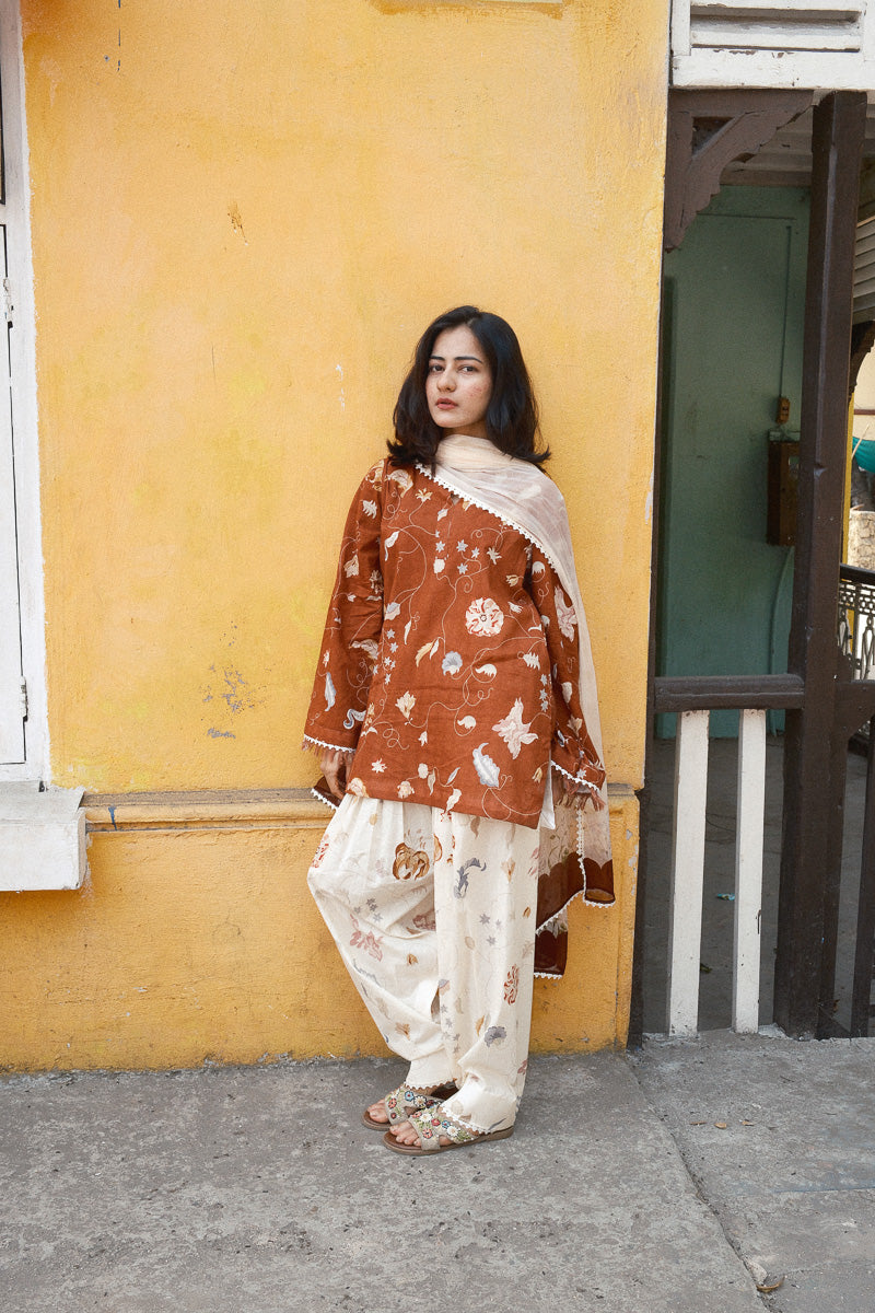 It is paired with an off-white printed khadi shalwar, finished with lace accents, and a soft chiffon dupatta carrying intricate floral motifs. Designed with pockets for everyday ease, without compromising on detail.